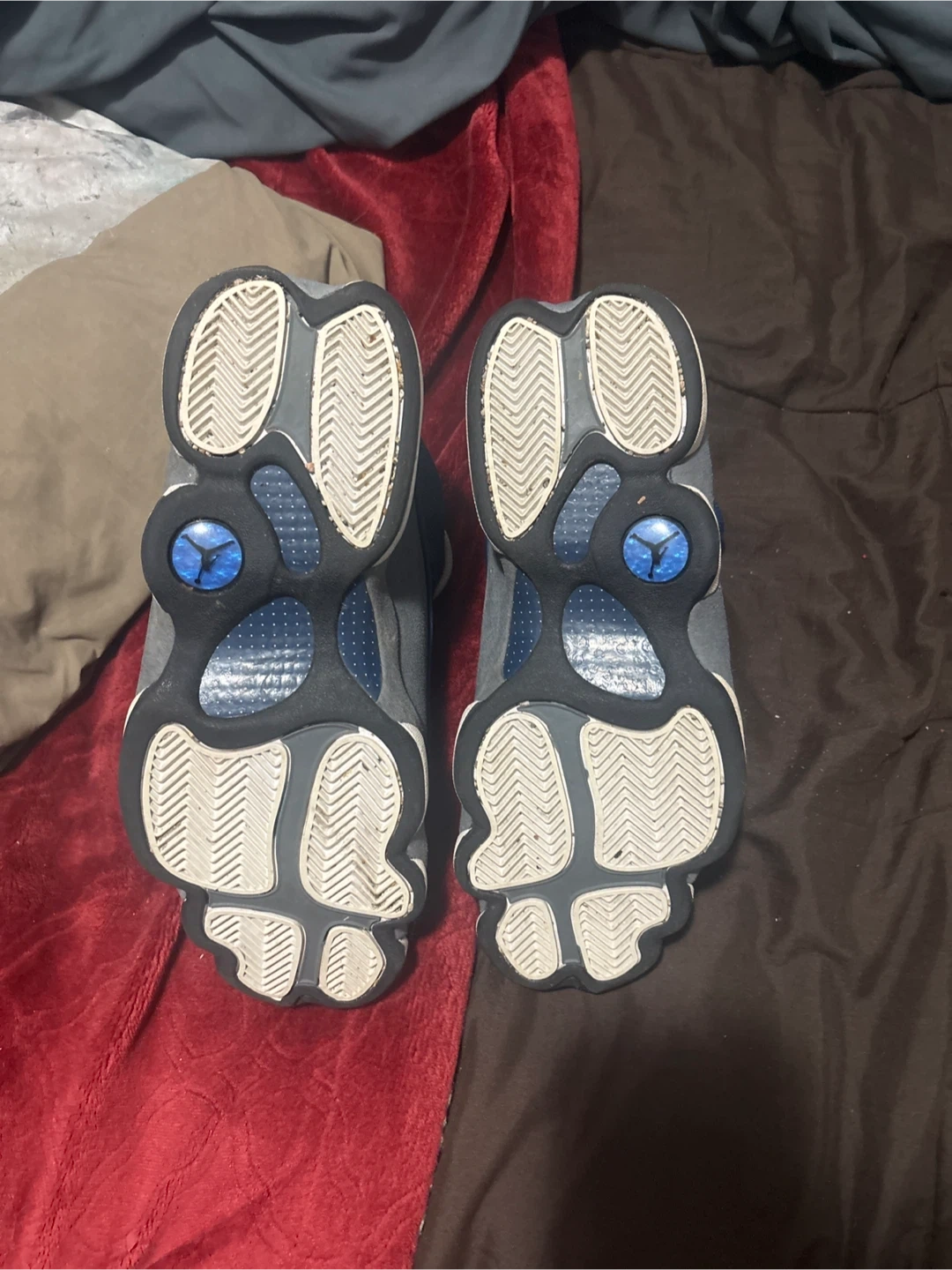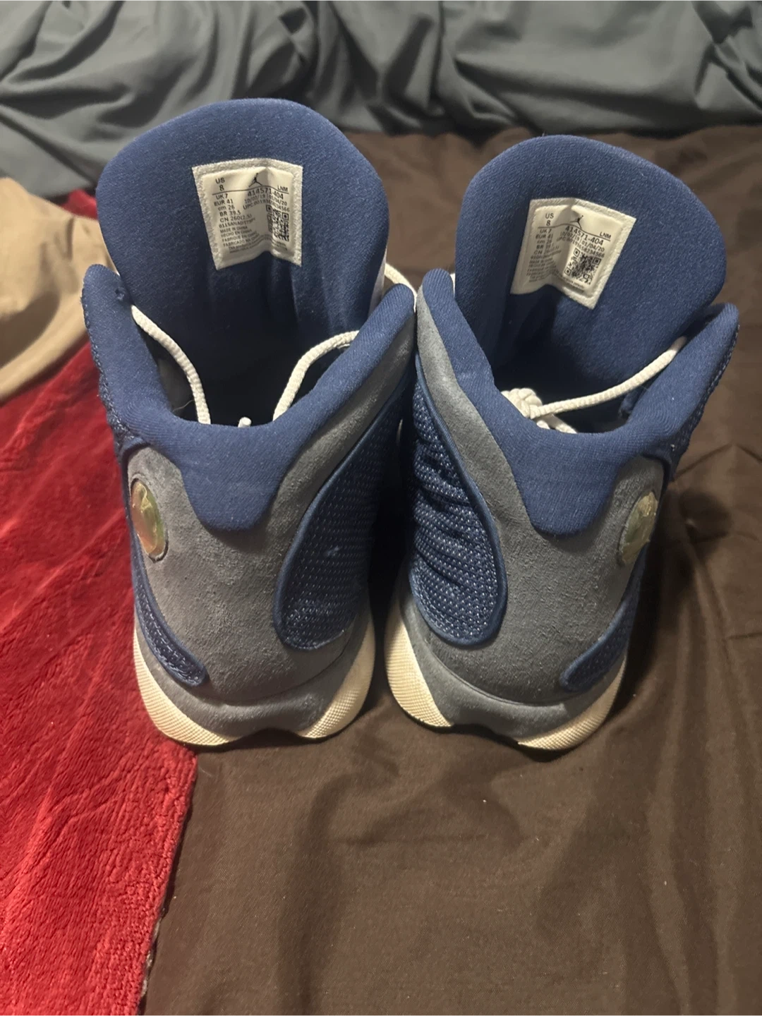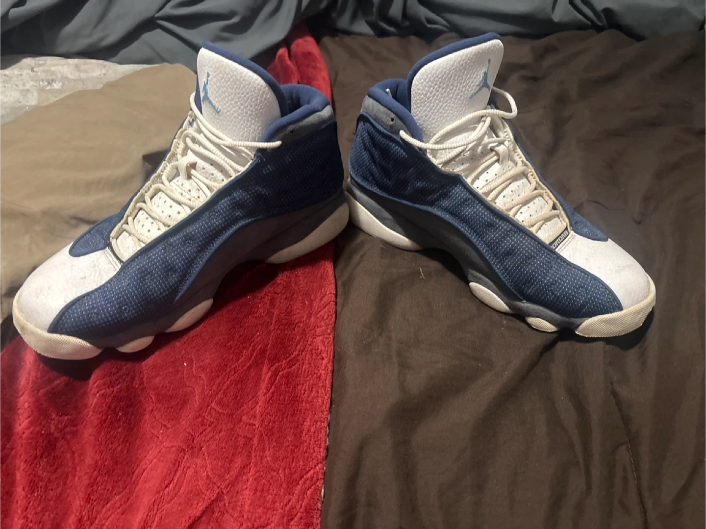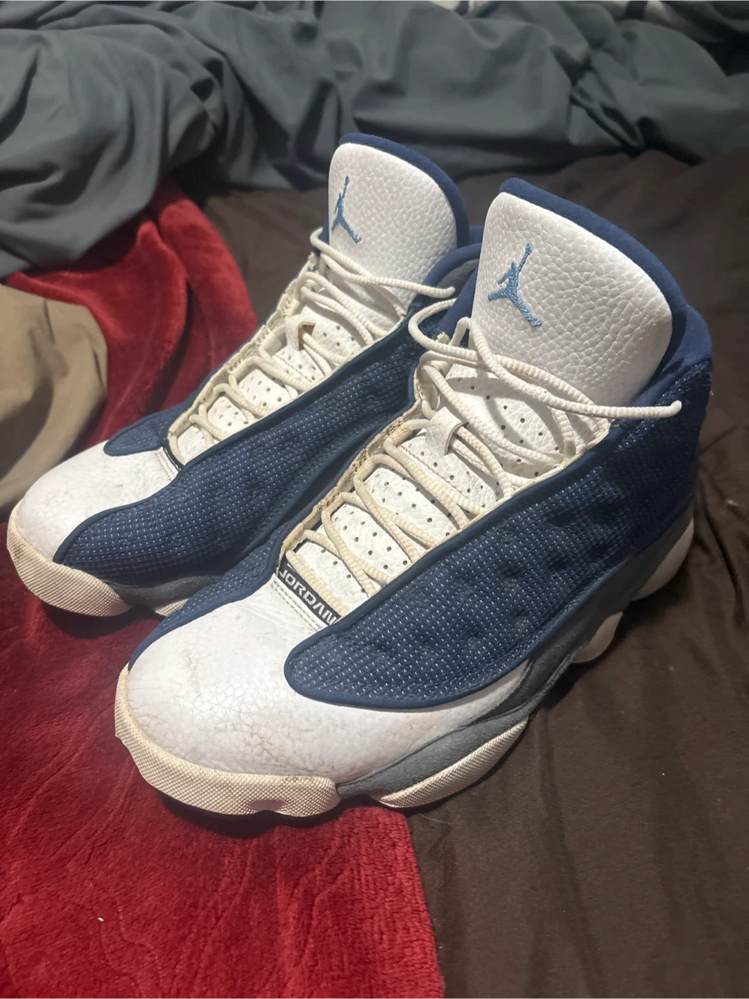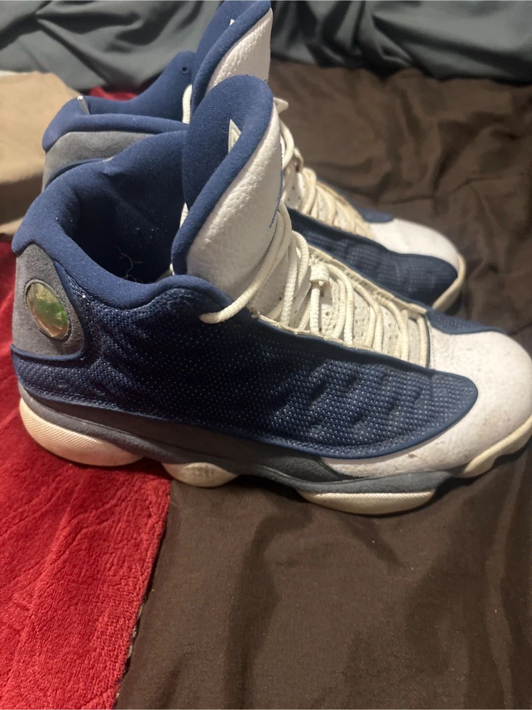 Selling a pair of Jordan XIII sneakers in navy and white. They show some signs of wear but still have lots of life left in them. Great for casual wear or hitting the court!