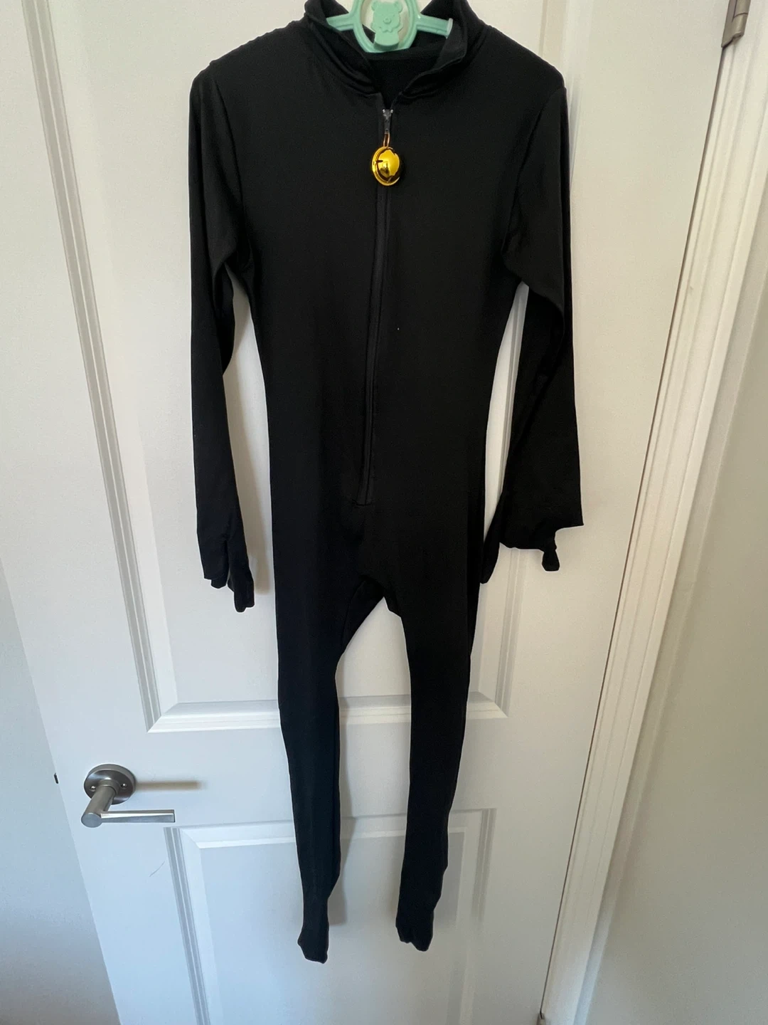 Selling a black catsuit jumpsuit. It has a zipper down the front and a gold bell detail. Perfect for a costume or just lounging around!