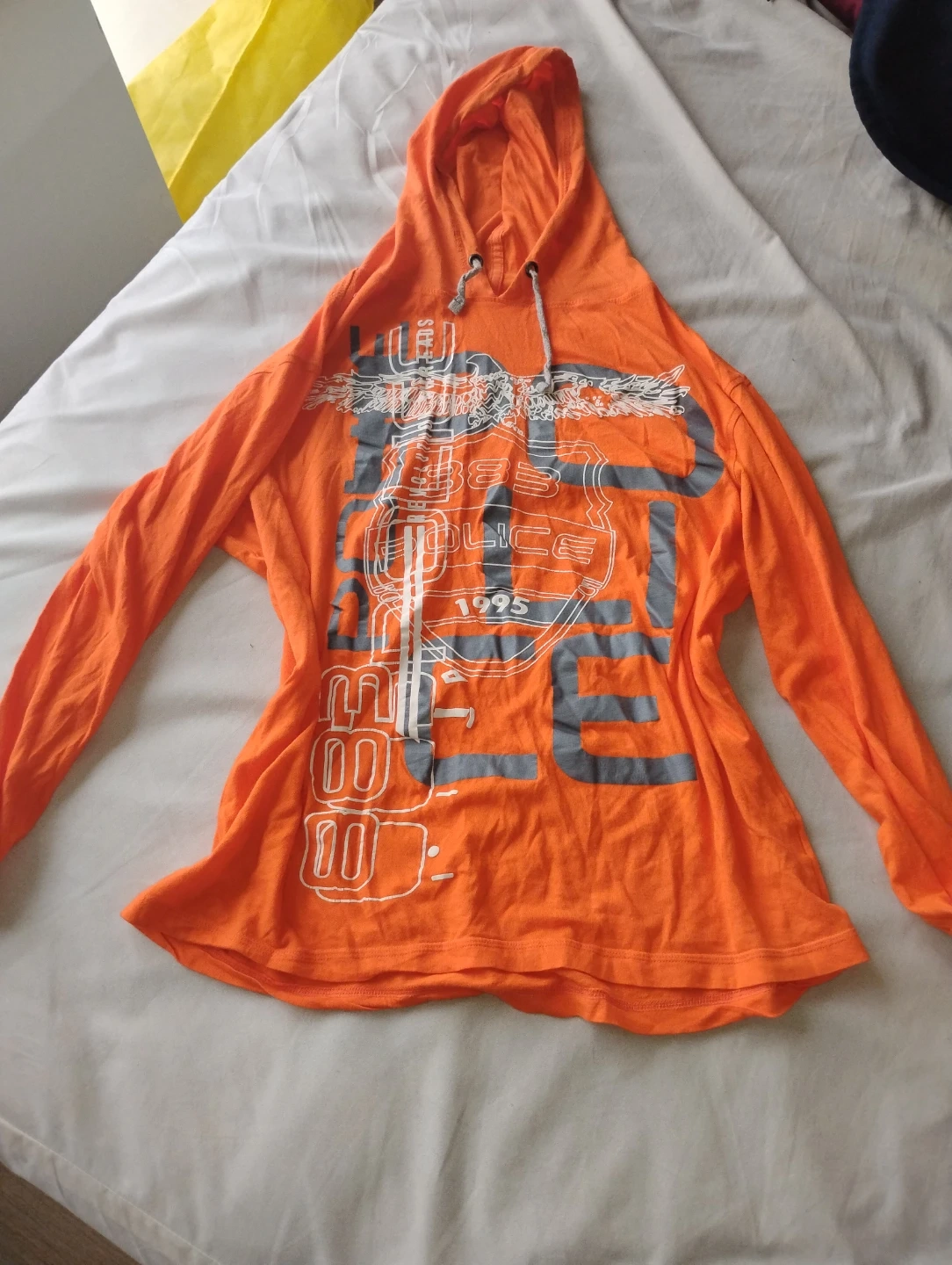 Selling an orange long-sleeved hoodie with a graphic design on the front. It's in good condition and ready for a new owner!