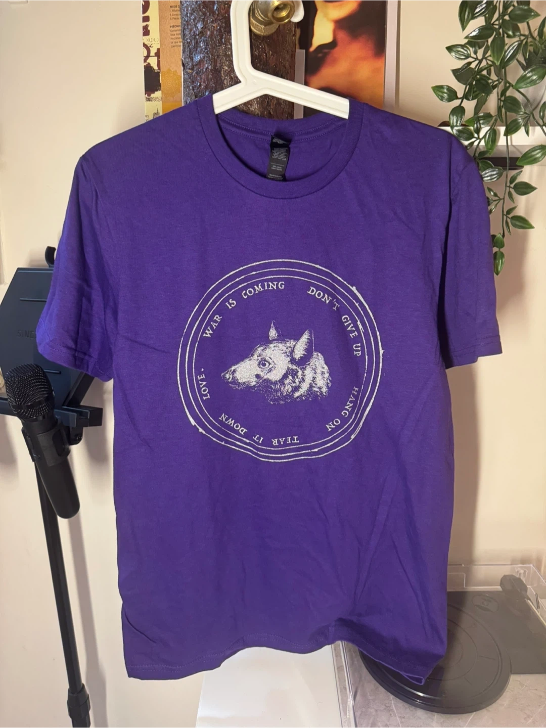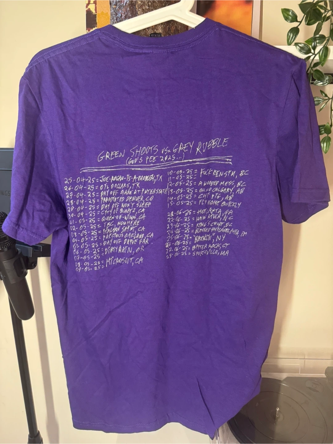 Selling a purple t-shirt with a unique design! The front features a graphic with the text 'WAR IS COMING' and 'DON'T GIVE UP'. The back lists tour dates and locations for 'GREEN SHOOTS vs. the GREY RUBBLE'.