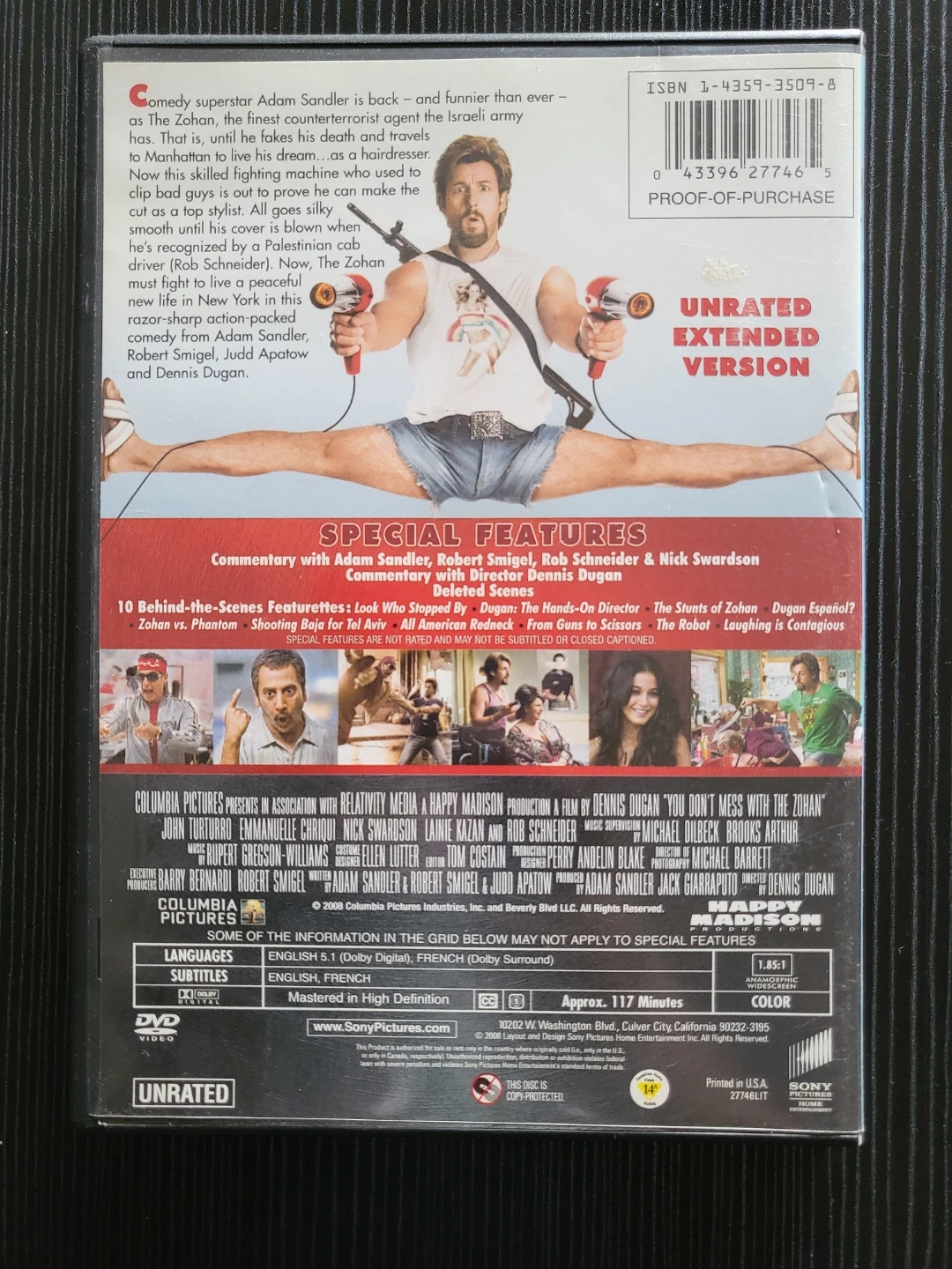 Selling a DVD of the movie 'You Don't Mess with the Zohan'. This is the unrated extended version. It includes special features like commentary, deleted scenes, and more! Enjoy Adam Sandler in this comedy.