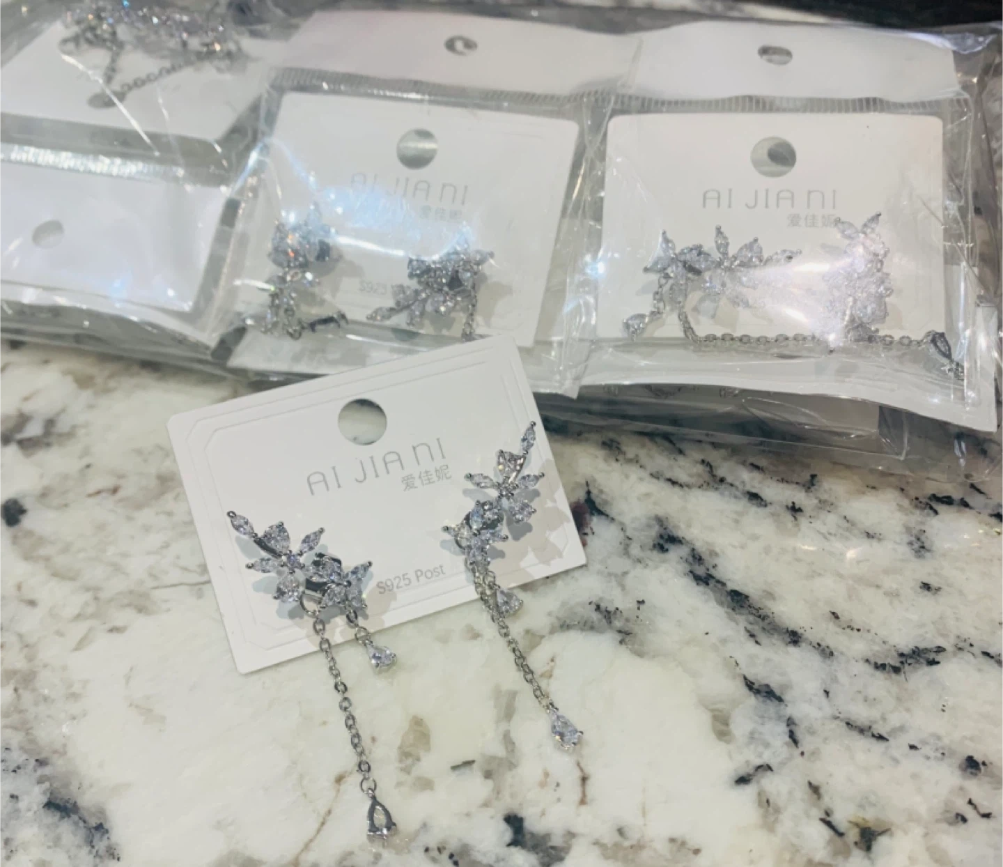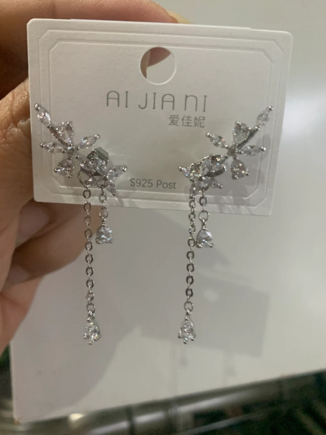 Selling a pair of brand new AI JIANI silver dangle earrings! These earrings have a beautiful, delicate design with sparkling stones. They're perfect for wedding or adding a touch of elegance to any outfit. The posts are made of S925 silver