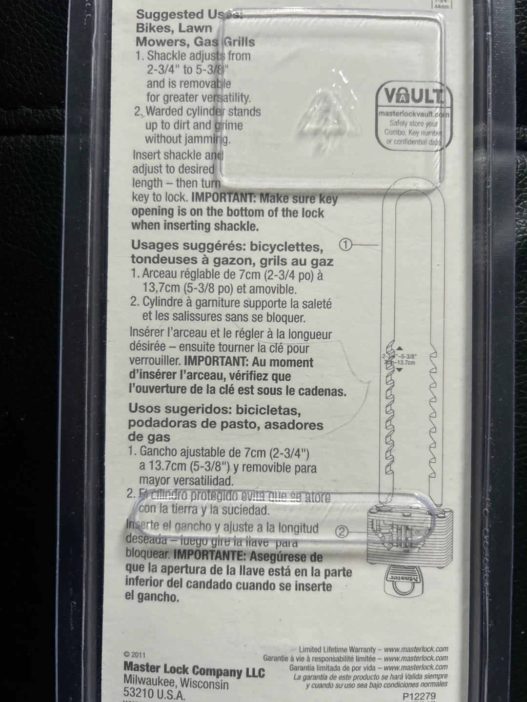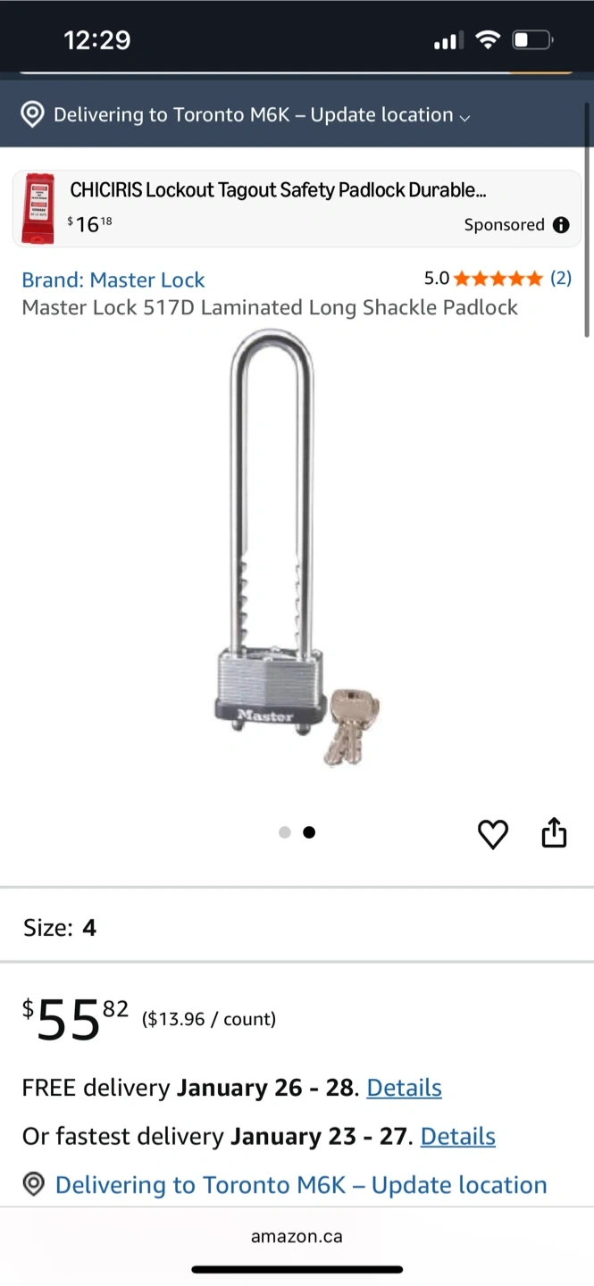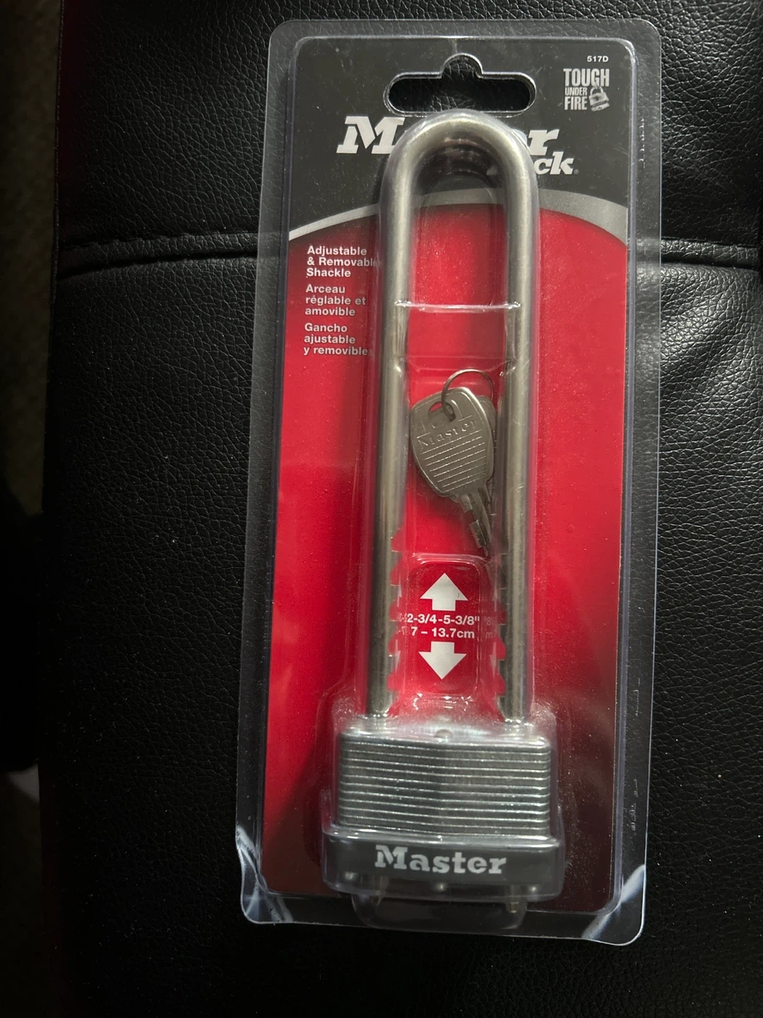 Selling a brand new Master Lock 517D laminated long shackle padlock! The shackle adjusts from 2-3/4" to 5-3/8" and is removable for greater versatility. The original price was $55.82