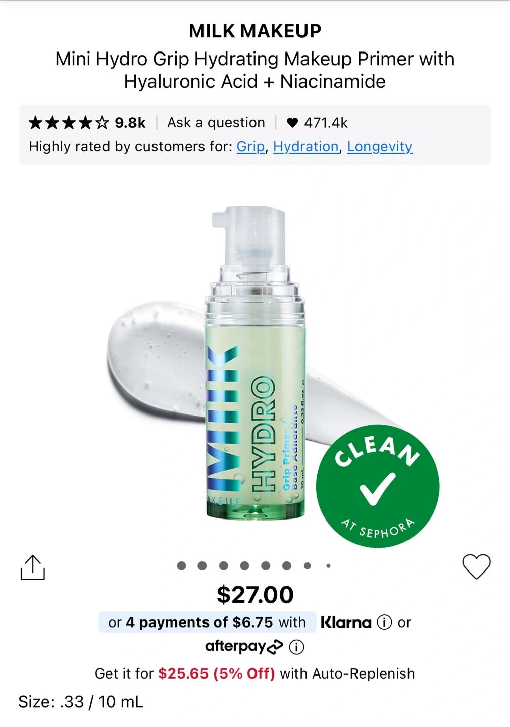 Selling a Milk Makeup Mini Hydro Grip Hydrating Makeup Primer with Hyaluronic Acid + Niacinamide. It's a great primer that's highly rated by customers for its grip, hydration, and longevity! Size: .33 / 10 mL. Retails for $27 plus tax