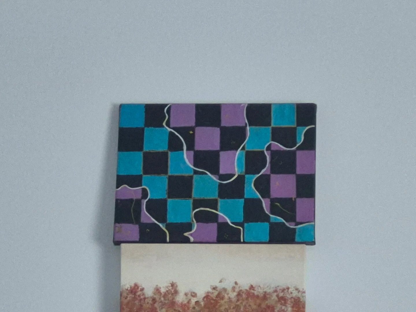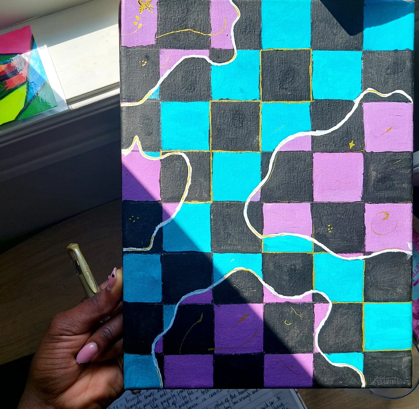 Here's a colourful abstract painting on canvas! It features a checkerboard pattern with black, purple, and turquoise squares, plus some white and gold accents. It's a fun piece to add some pop to your space