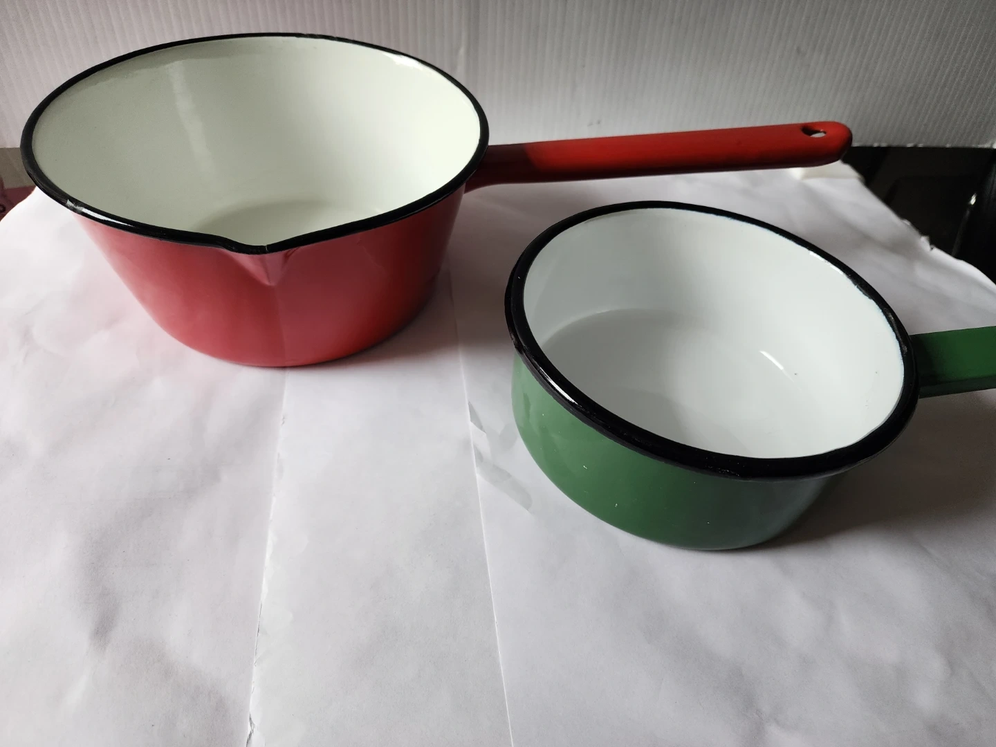 Two enamel sauce pans are available. One is red with a white interior and a red handle. The other is green with a white interior and a green handle.