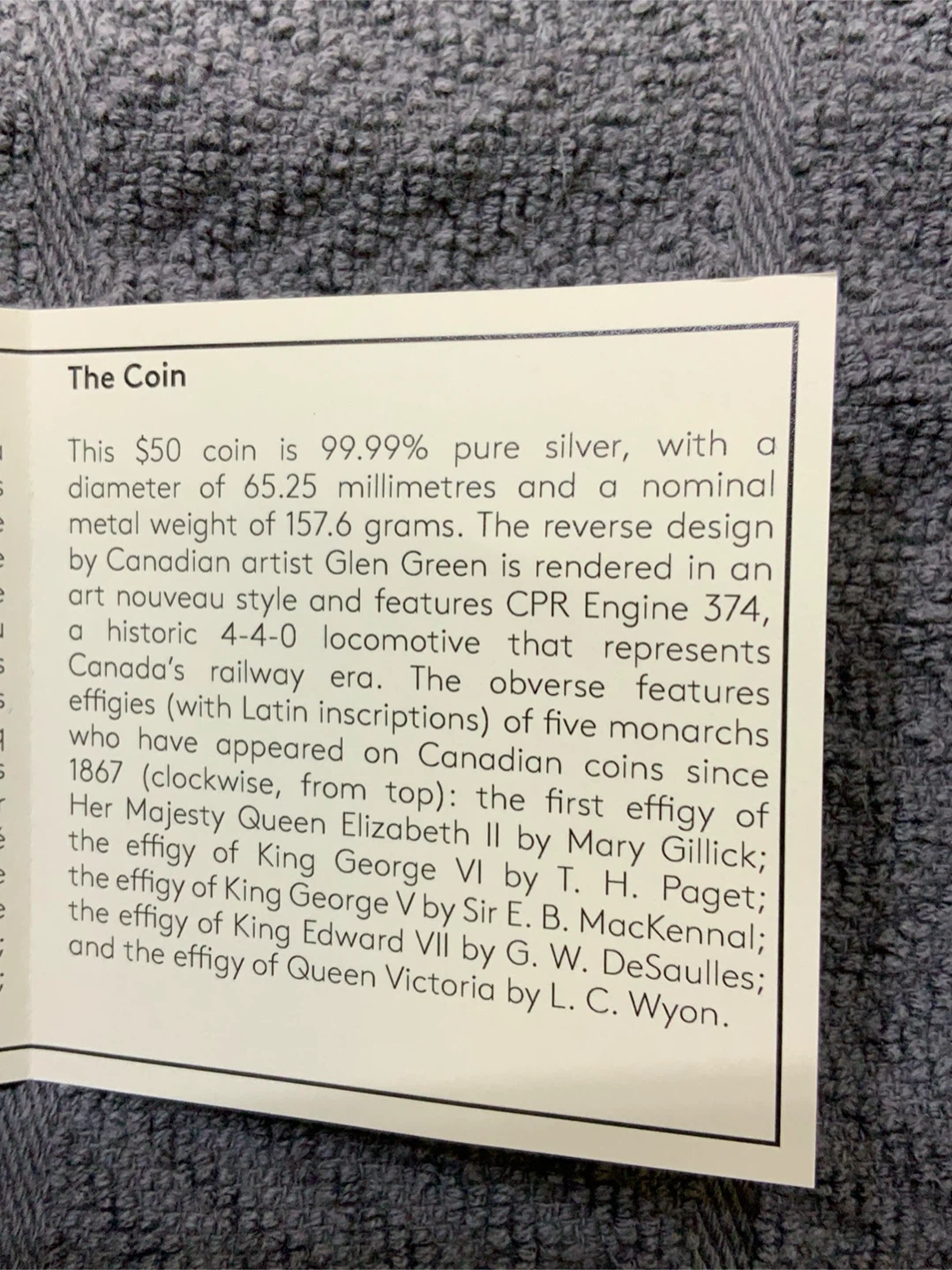 - The reverse design by Canadian artist Glen Green is rendered in an art nouveau style and features CPR Engine 374