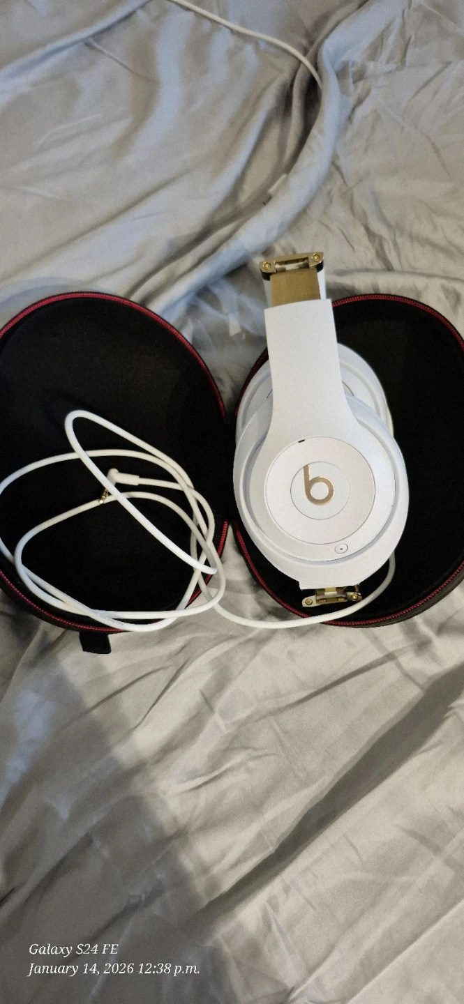 Selling a pair of Beats Studio3 wireless headphones in a stylish white and gold finish! They come with their original carrying case and cable for wired listening. These headphones are known for their premium sound quality and comfortable fit, perfect for enjoying your favourite tunes on the go