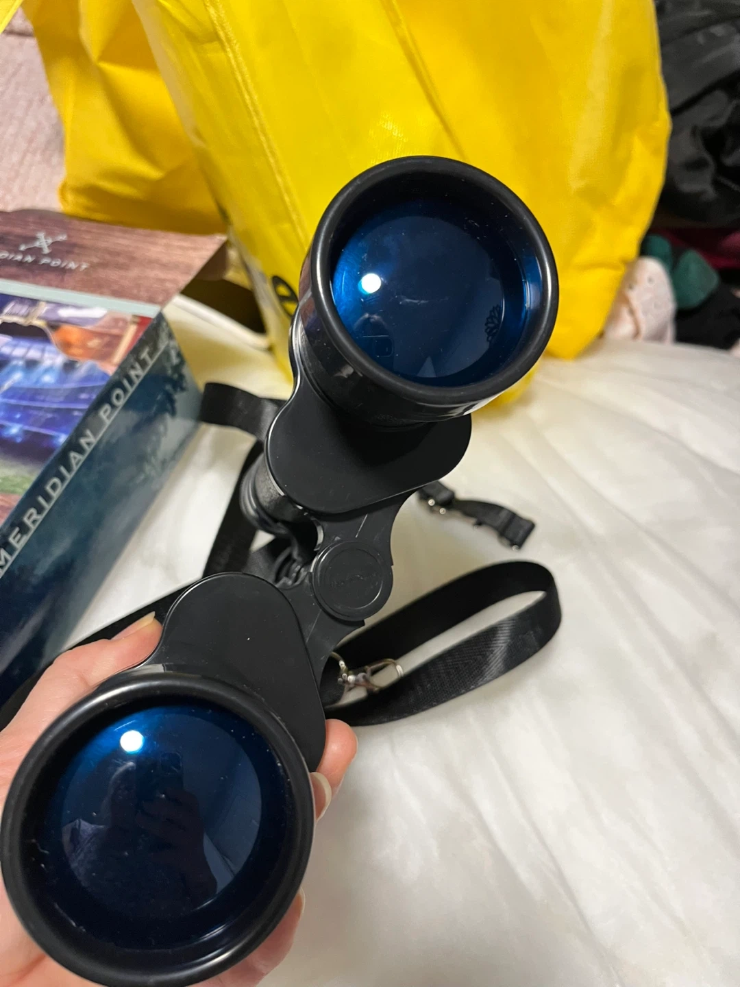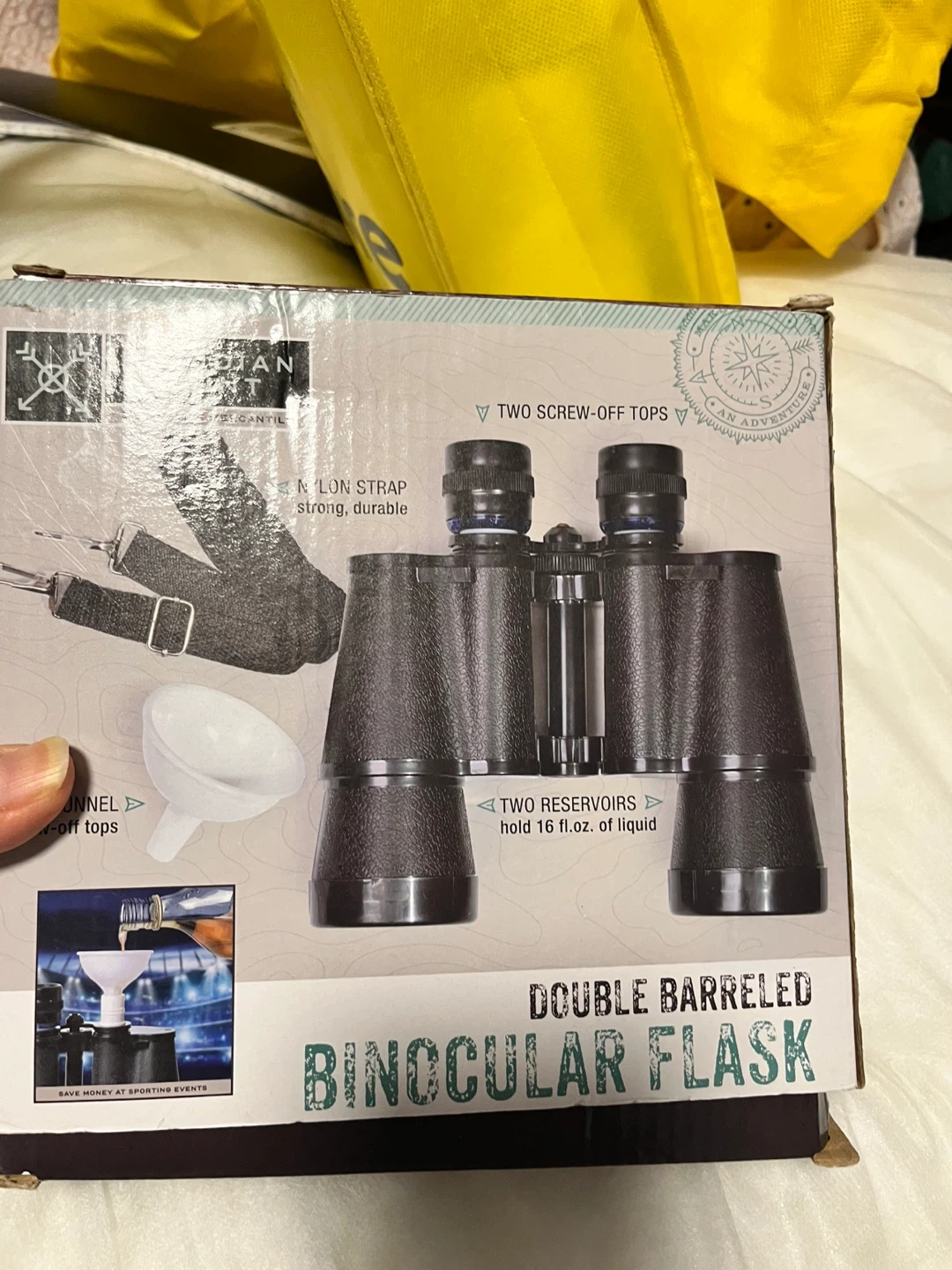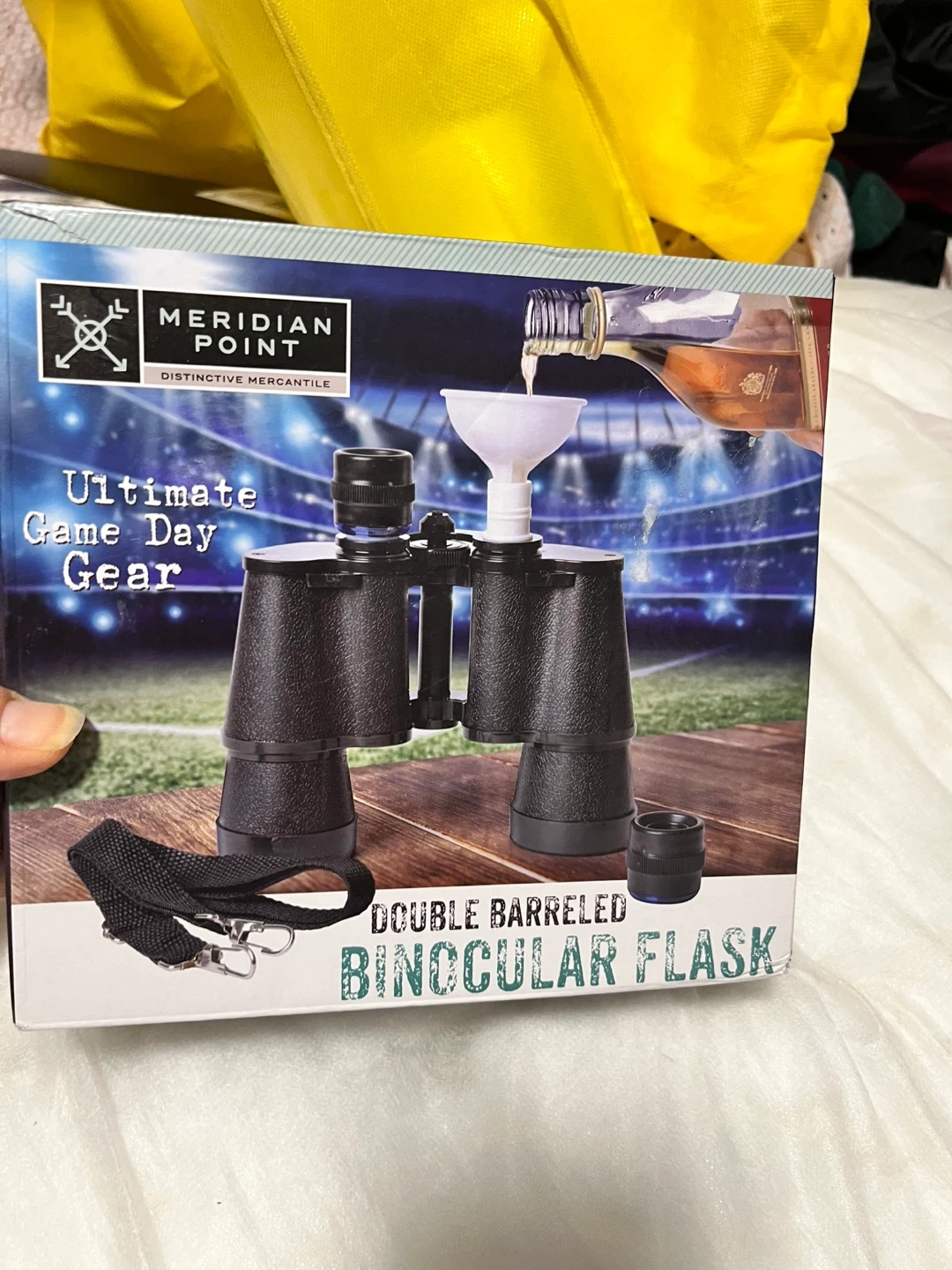 Selling a Meridian Point double barreled binocular flask. It's ultimate game day gear! It has two reservoirs that can hold 16 fl.oz. of liquid each. It also comes with a nylon strap, two screw-off tops, and a funnel. The box is included