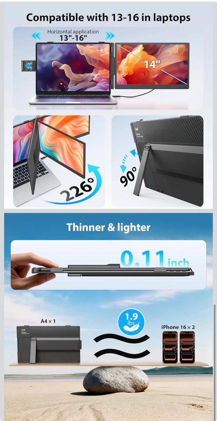 14'' Dual Laptop Screen Extender, 1080P FHD Laptop Extended Monitor Portable with Speaker, Plug-Play Second Monitor for 13-16'' Laptops, Work with Mac, Window, Chrome