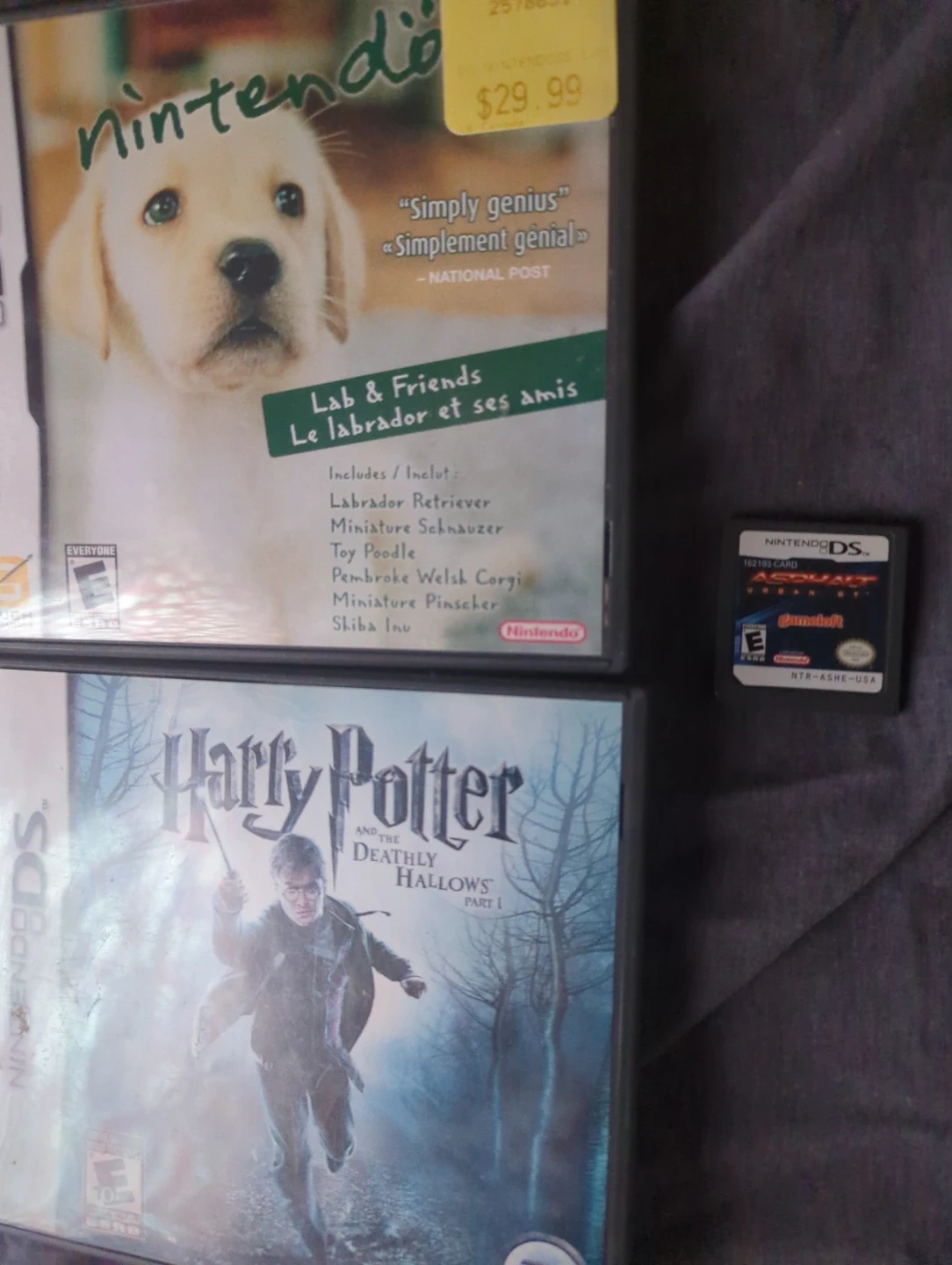 Selling two Nintendo DS games. One is Lab & Friends: Le labrador et ses amis, which includes Labrador Retriever, Miniature Schnauzer, Toy Poodle, Pembroke Welsh Corgi, Miniature Pinscher, and Shiba Inu. The other game is Harry Potter and the Deathly Hallows Part 1. 3 games total asphalt loose urban gt
