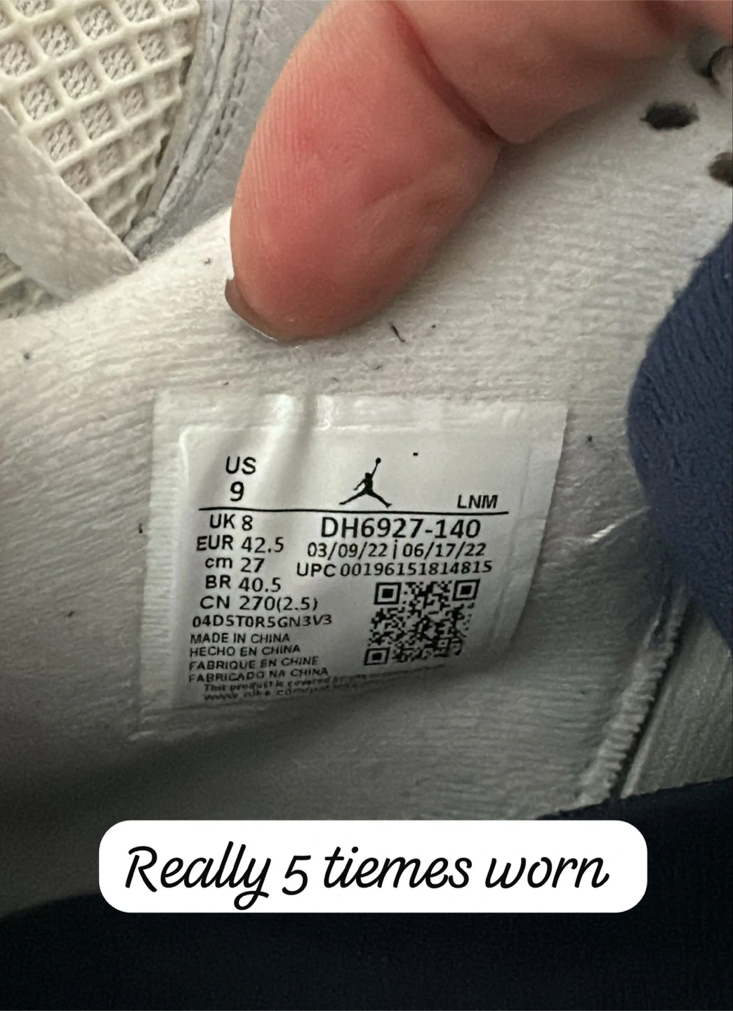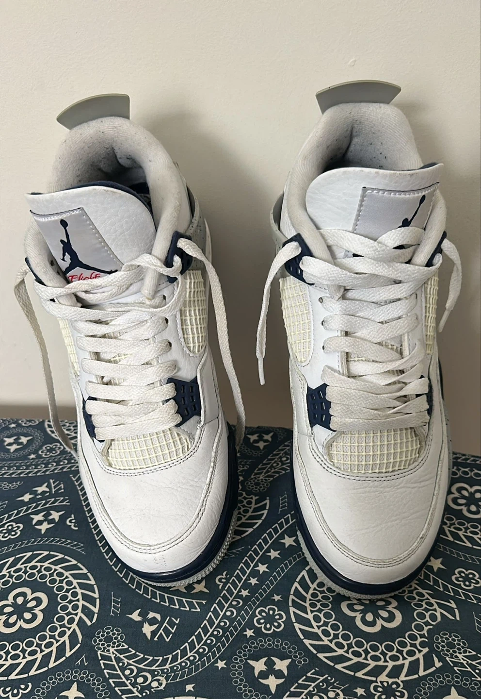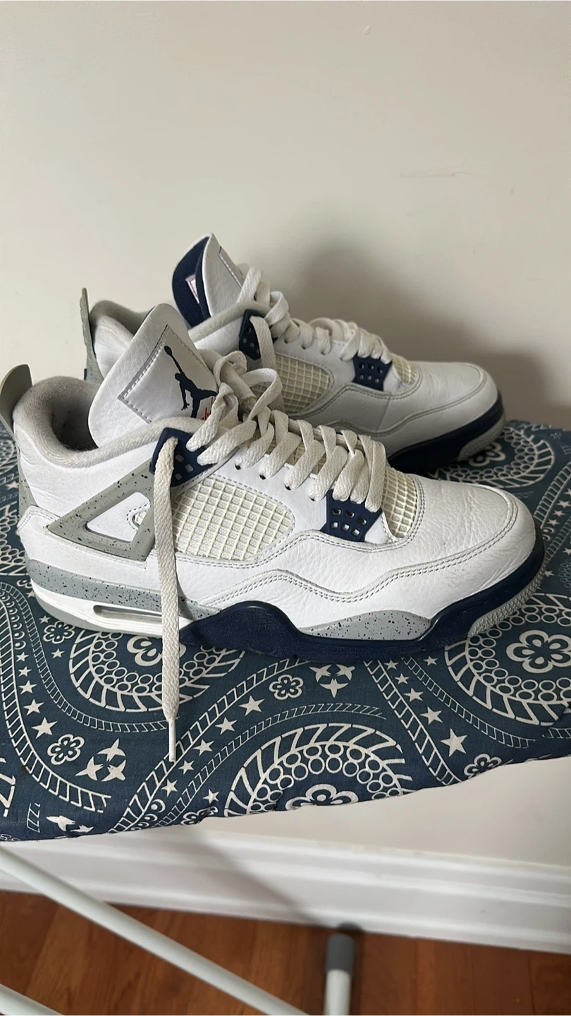 Selling a pair of Air Jordan 4 Retros in a clean white and navy colourway. They're in great shape, only worn about five times! The size is a US 9.