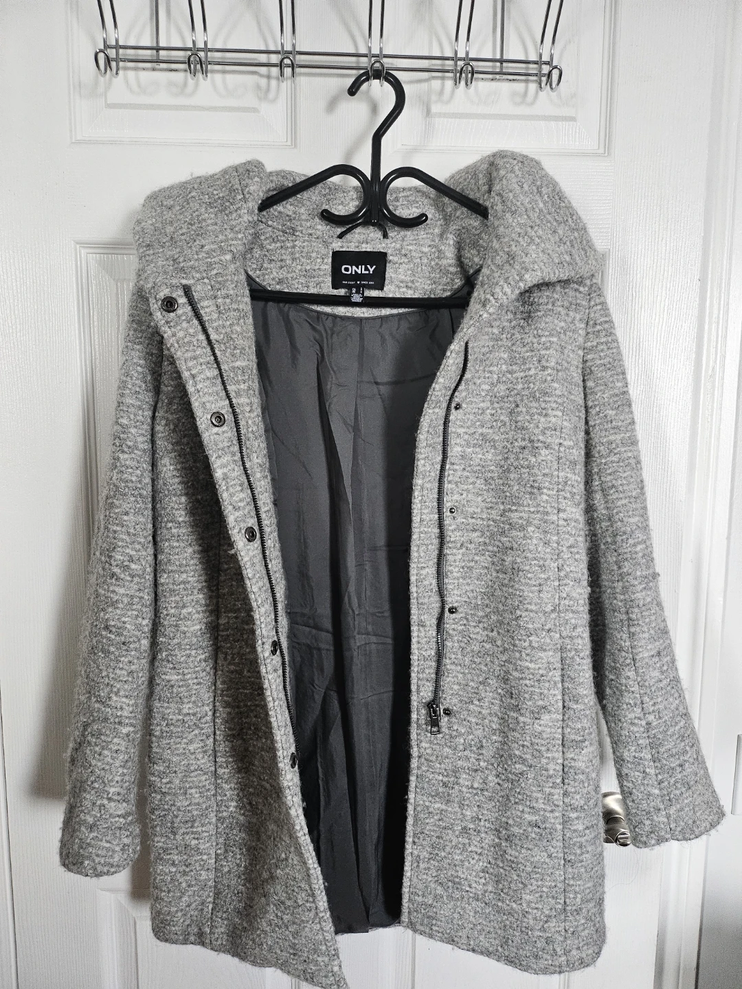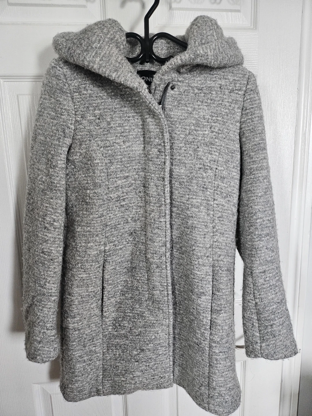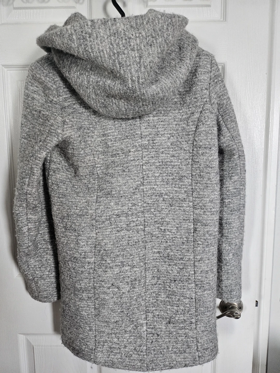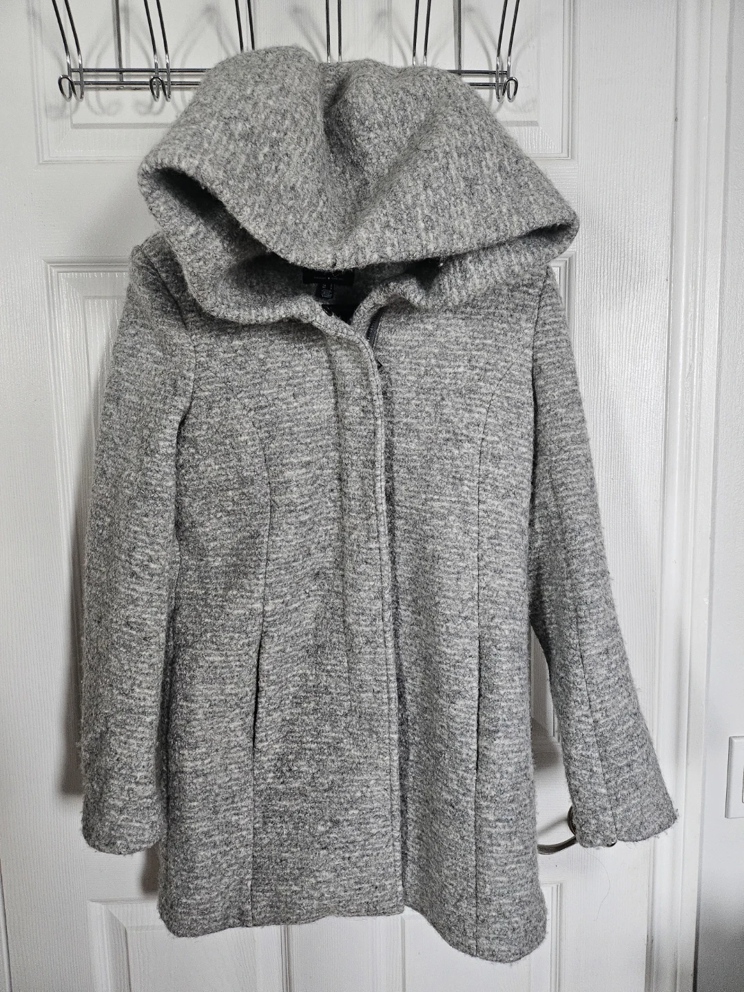 Selling a lovely grey hooded wool coat from Simons! It's a size small and perfect for cool weather. The material is soft and cozy, making it a great addition to your wardrobe. It features a stylish hood and a comfortable fit.