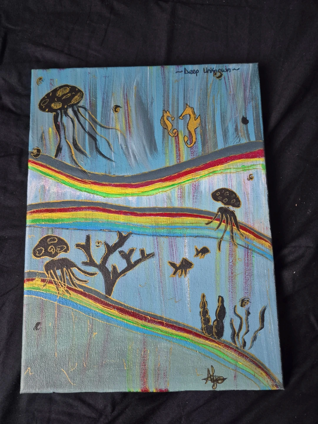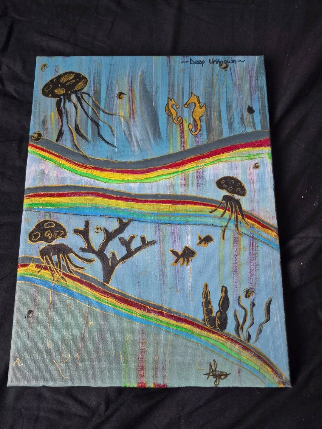 A hand-painted, original acrylic piece on canvas that explores the mystery and beauty of the underwater world. Titled "Deep Unknown," this artwork features golden-detailed jellyfish, seahorses, and coral drifting through vibrant, rainbow-colored currents.