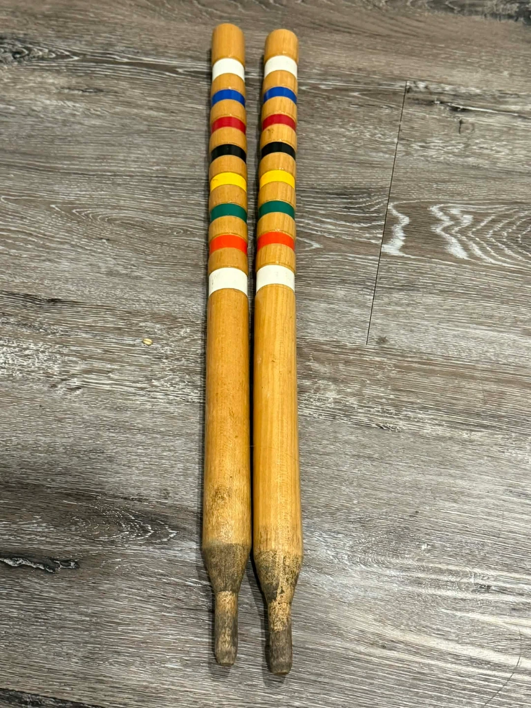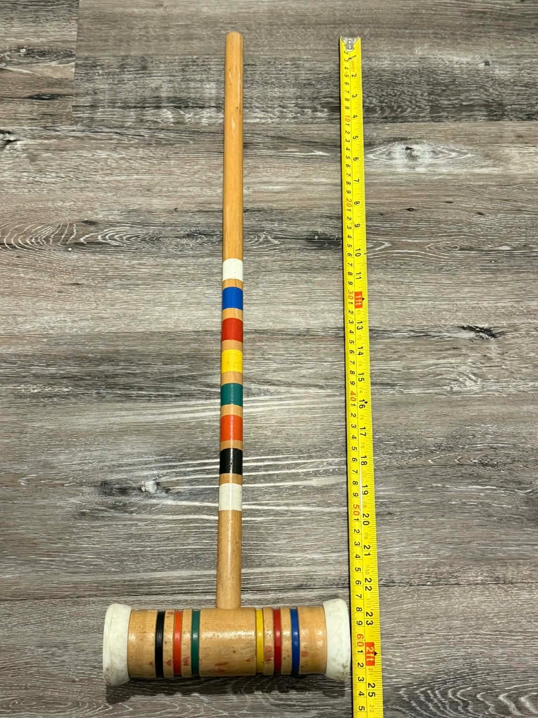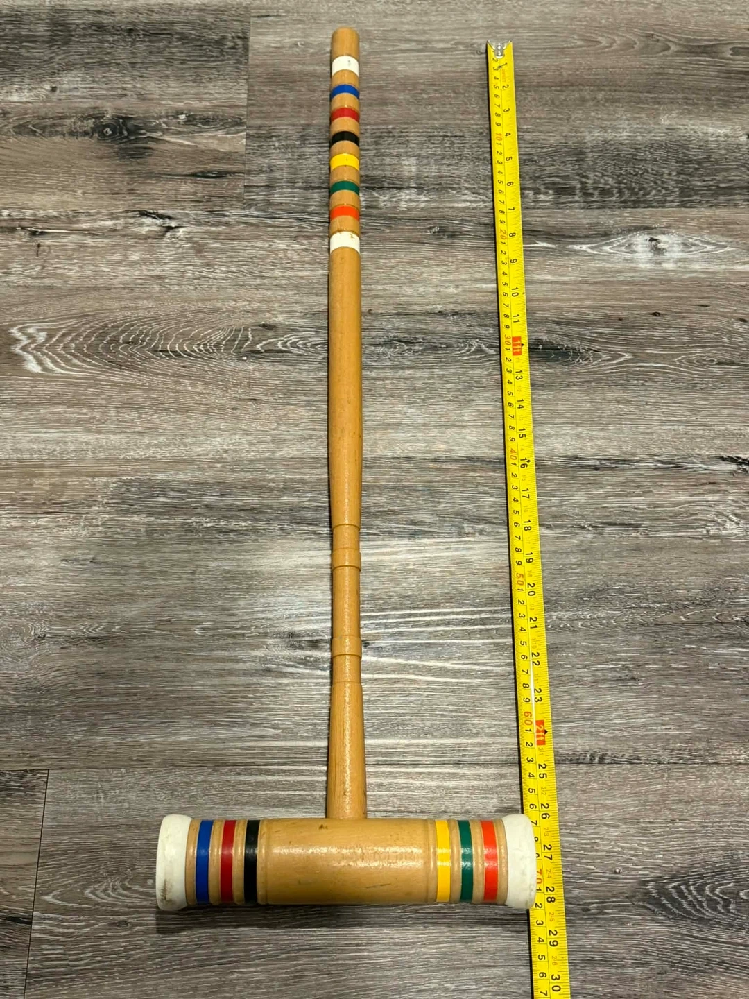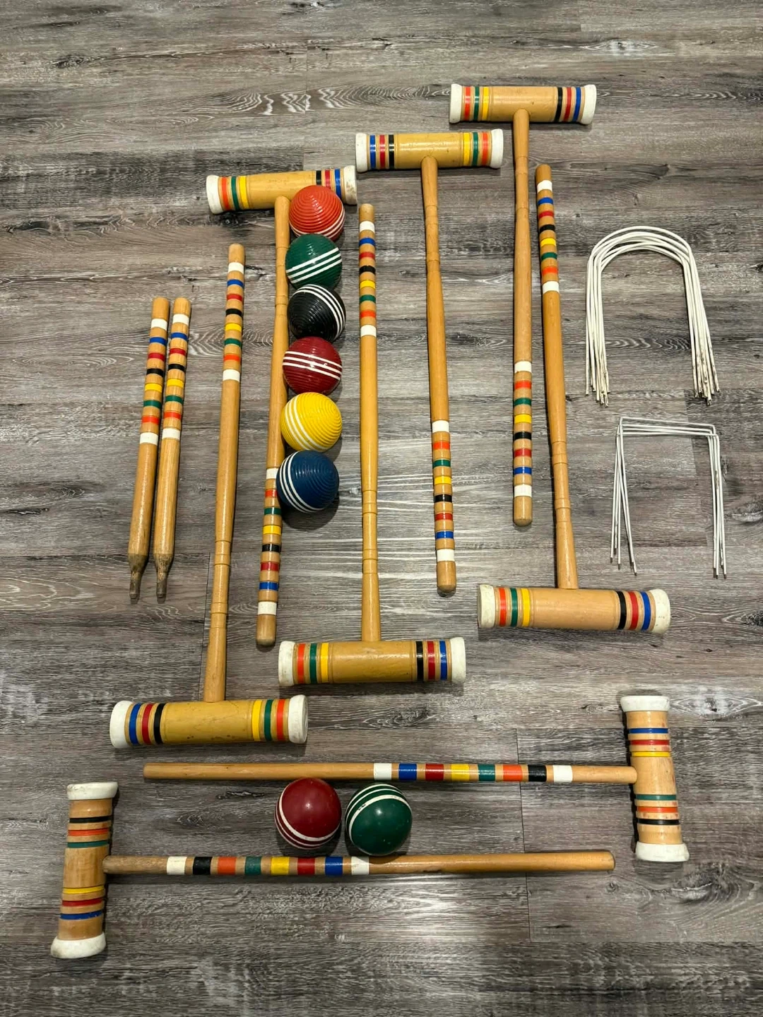 Selling a vintage croquet set! It includes mallets, balls, and wickets. The mallets have colourful stripes and the balls are also brightly coloured. Perfect for some outdoor fun!