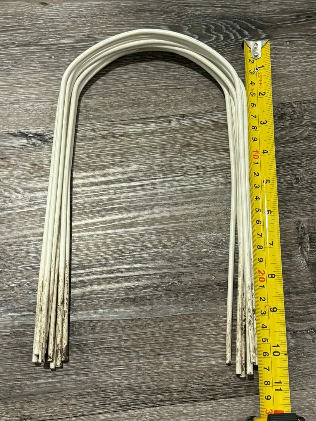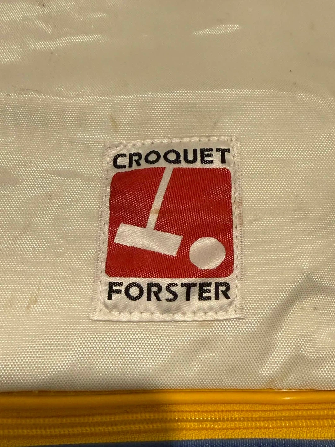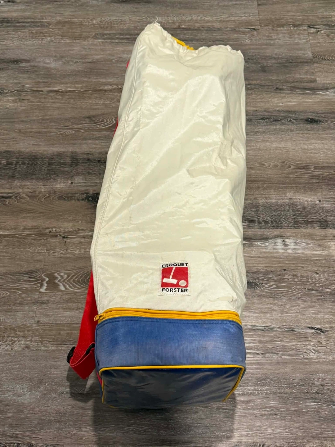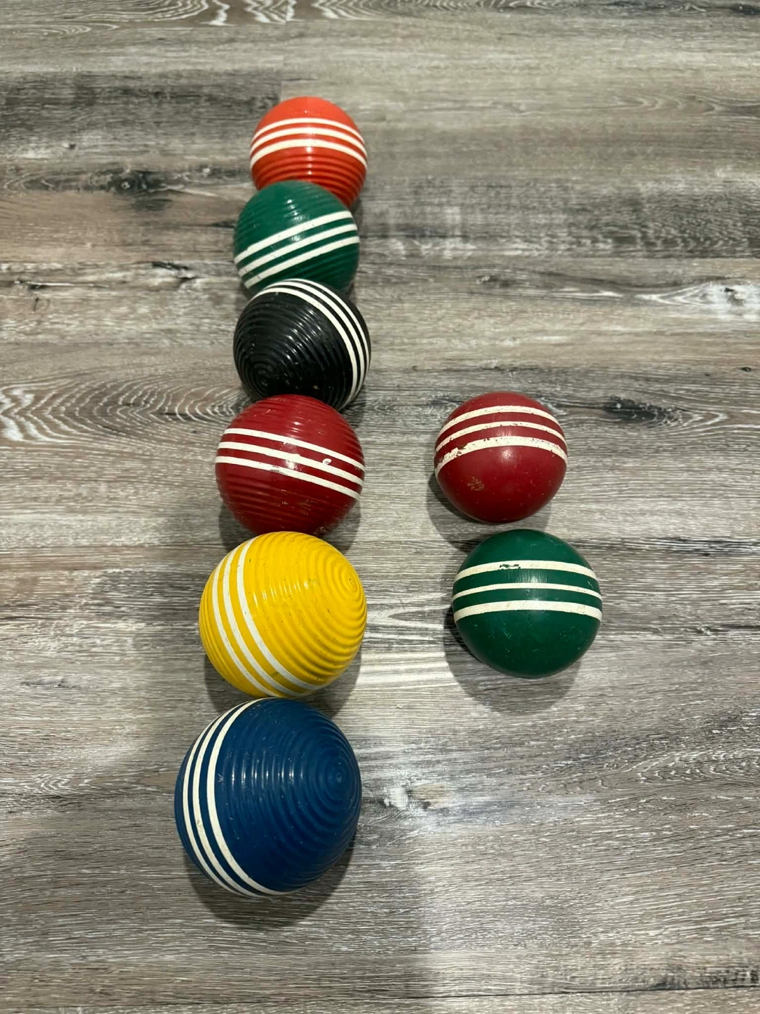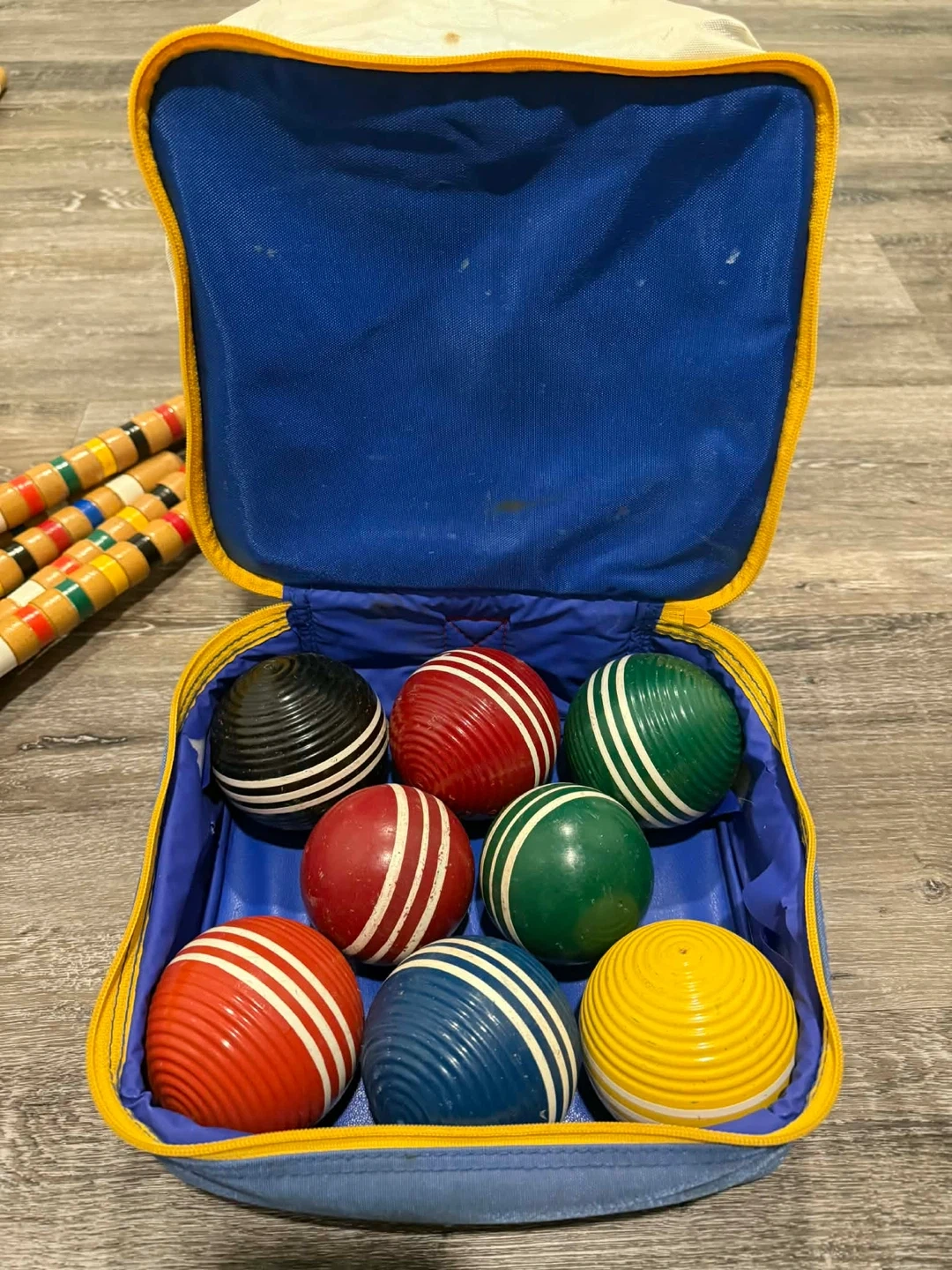 Selling a vintage croquet set! It includes mallets, balls, and wickets. The mallets have colourful stripes and the balls are also brightly coloured. Perfect for some outdoor fun!