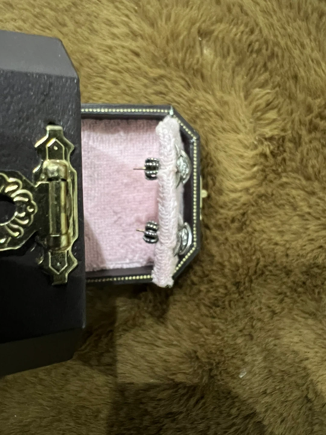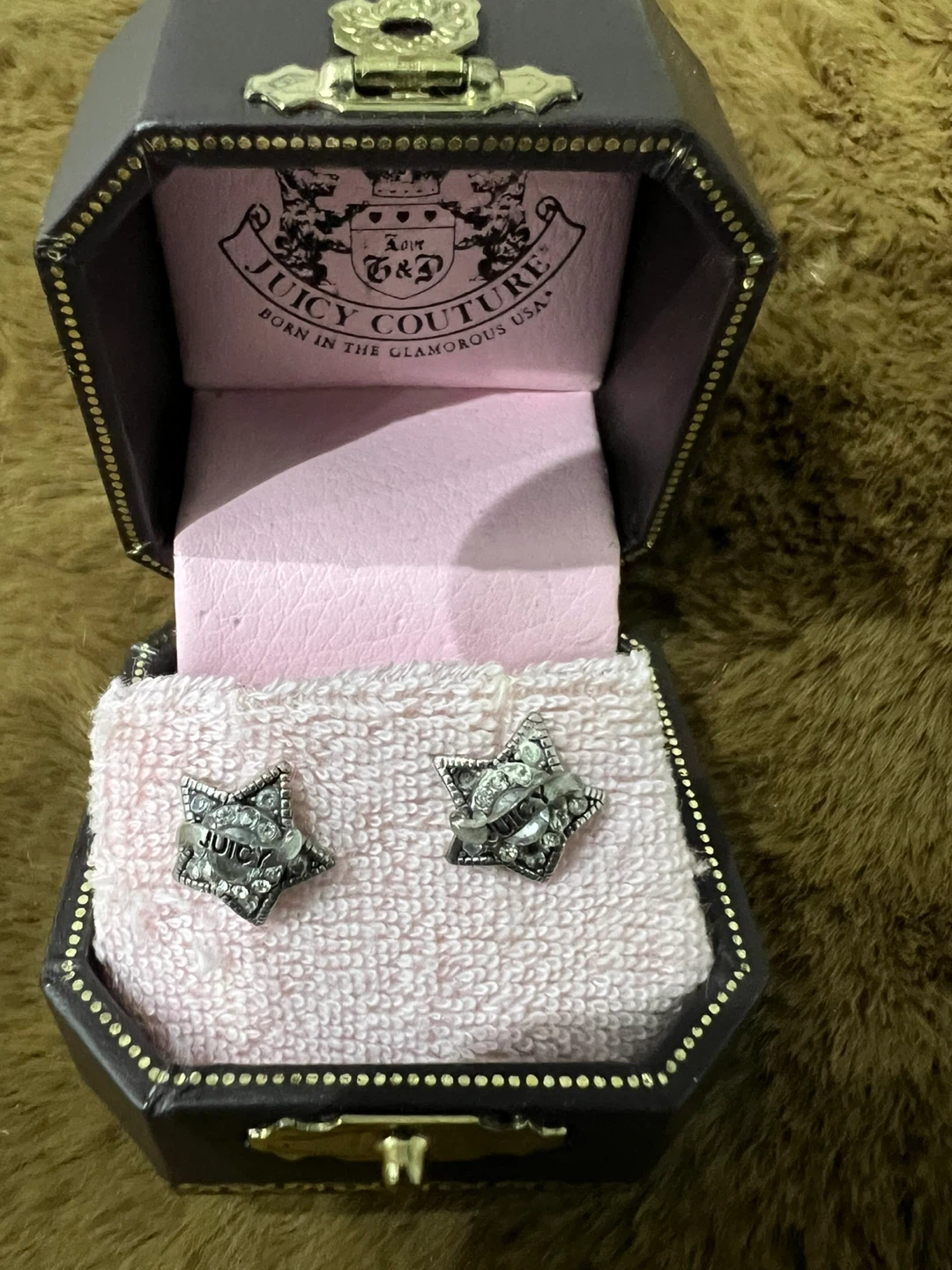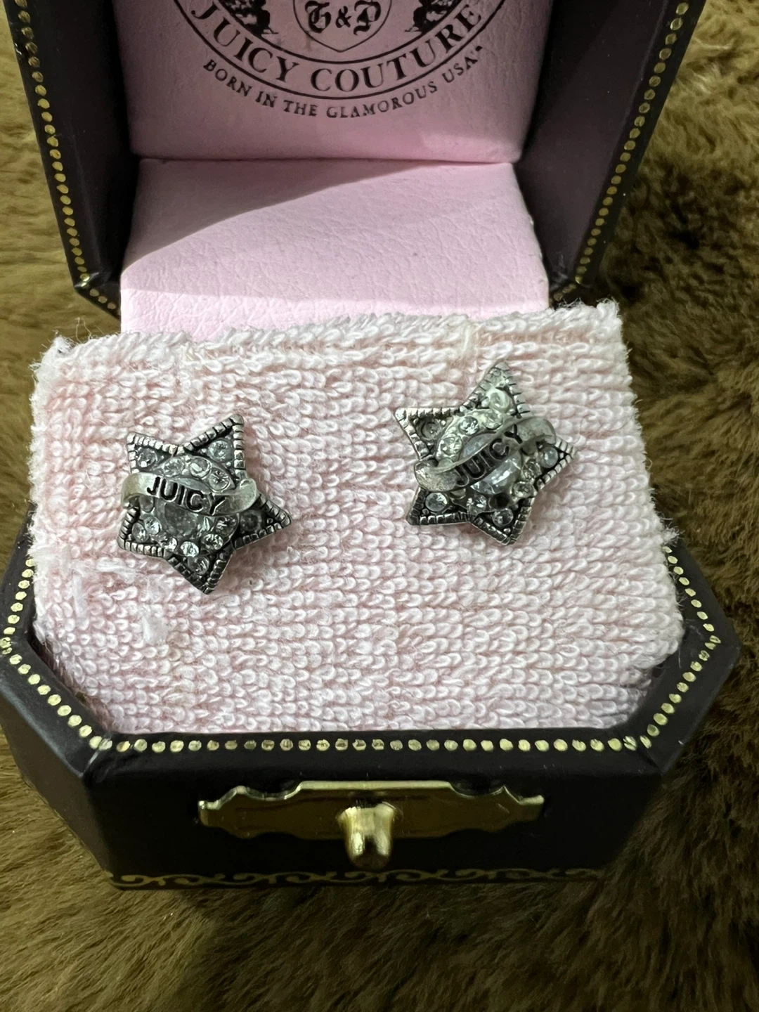 These are a pair of Juicy Couture star stud earrings! They come in the original box, perfect for gifting or keeping them safe. The earrings have a cute star design with the word 'Juicy' on them.
