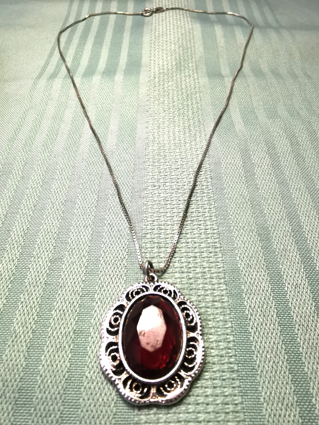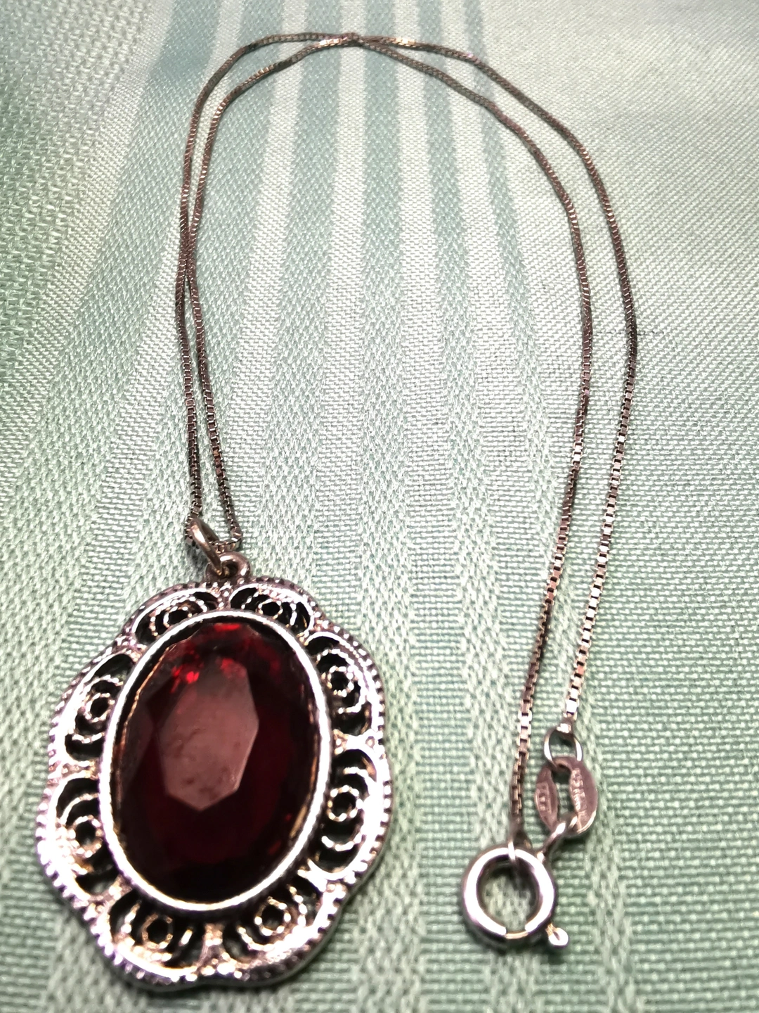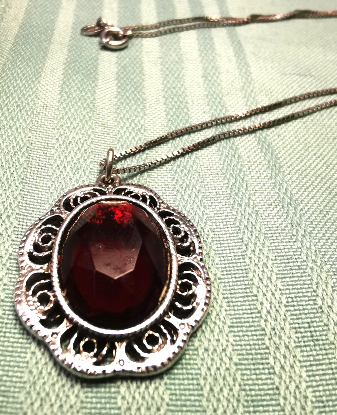 High-quality 18-inch Italian Sterling Silver Box Chain. The necklace is hallmarked "925 ITALY" and includes the "PAT" stamp on the connector tag. The box link is known for its durability and smooth feel against the skin. The chain comes with a vintage-style statement pendant (1.25" x 1"). The pendant showcases a large, faceted deep-red faux garnet stone held in an ornate, silver-tone filigree scroll-work frame. Chain Style: Italian Box Link Chain Material: Solid 925 Sterling Silver Necklace Length: 18 Inches Clasp: Spring Ring Clasp Pendant Size: 1.25" Long x 1" Wide Pendant Material: Silver-tone costume metal (Not Silver) Condition: The set is in good vintage condition. The sterling silver chain remains bright and fluid with a functional spring clasp. The pendant is in solid shape with the red stone securely set and showing nice clarity.
