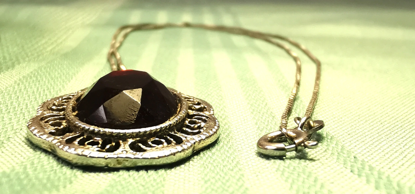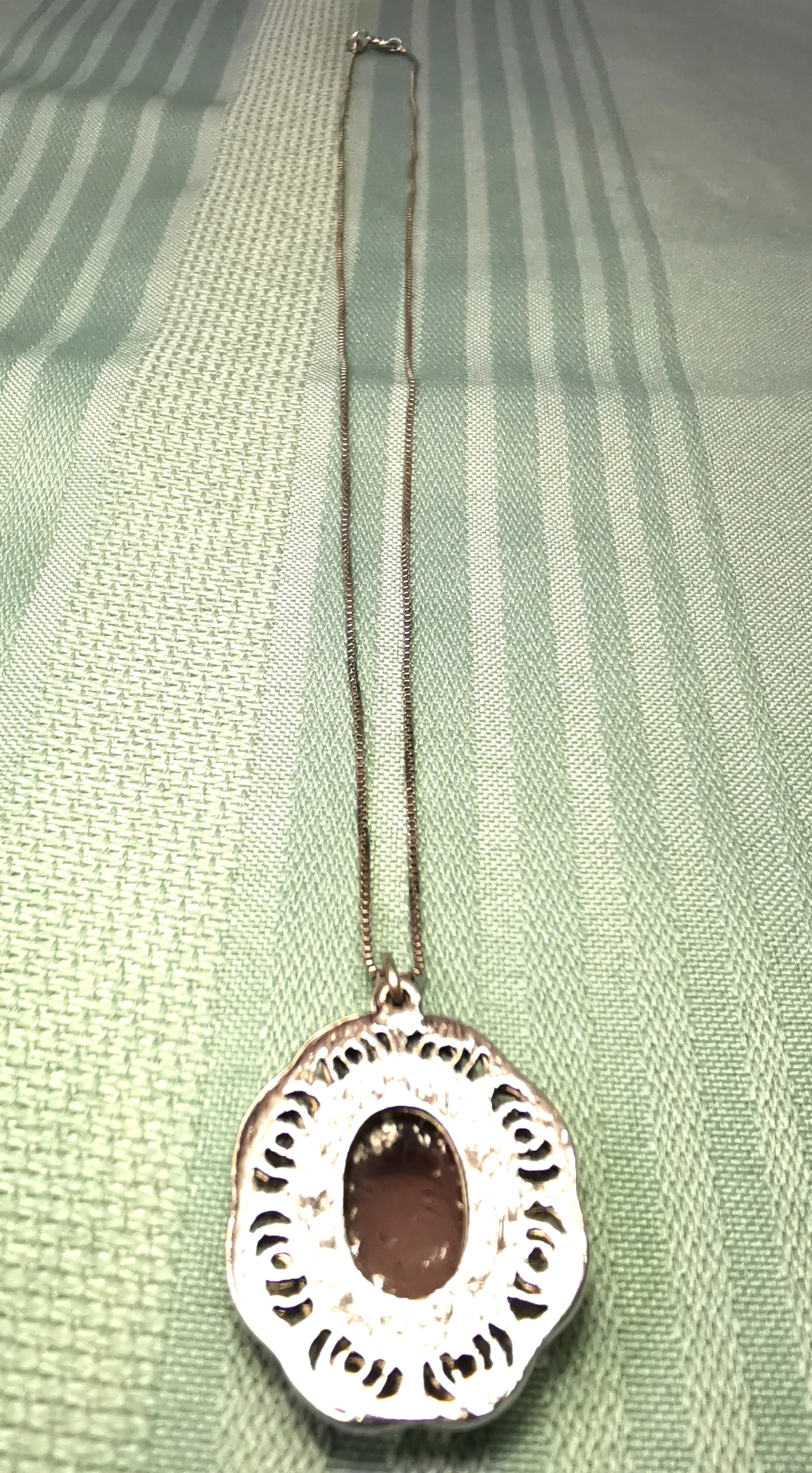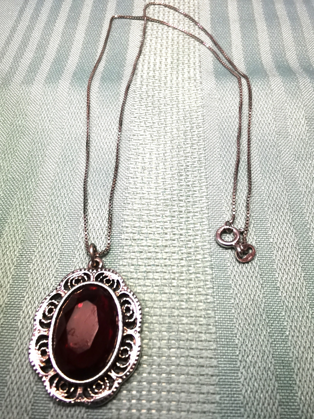 High-quality 18-inch Italian Sterling Silver Box Chain. The necklace is hallmarked "925 ITALY" and includes the "PAT" stamp on the connector tag. The box link is known for its durability and smooth feel against the skin. The chain comes with a vintage-style statement pendant (1.25" x 1"). The pendant showcases a large, faceted deep-red faux garnet stone held in an ornate, silver-tone filigree scroll-work frame. Chain Style: Italian Box Link Chain Material: Solid 925 Sterling Silver Necklace Length: 18 Inches Clasp: Spring Ring Clasp Pendant Size: 1.25" Long x 1" Wide Pendant Material: Silver-tone costume metal (Not Silver) Condition: The set is in good vintage condition. The sterling silver chain remains bright and fluid with a functional spring clasp. The pendant is in solid shape with the red stone securely set and showing nice clarity.