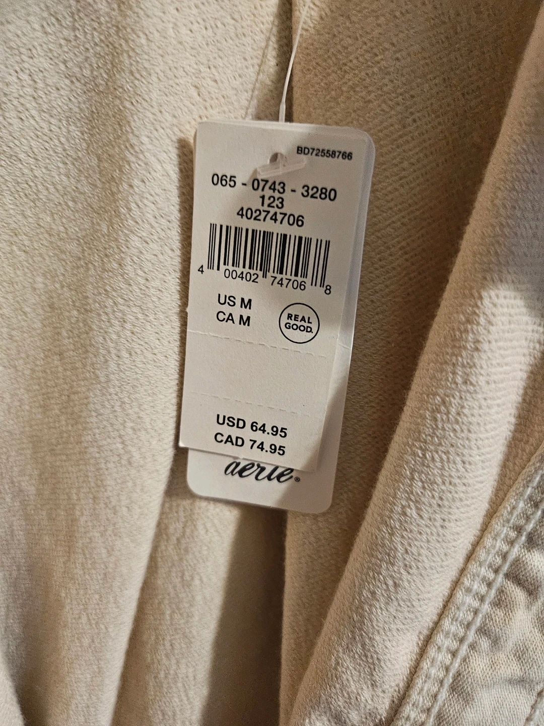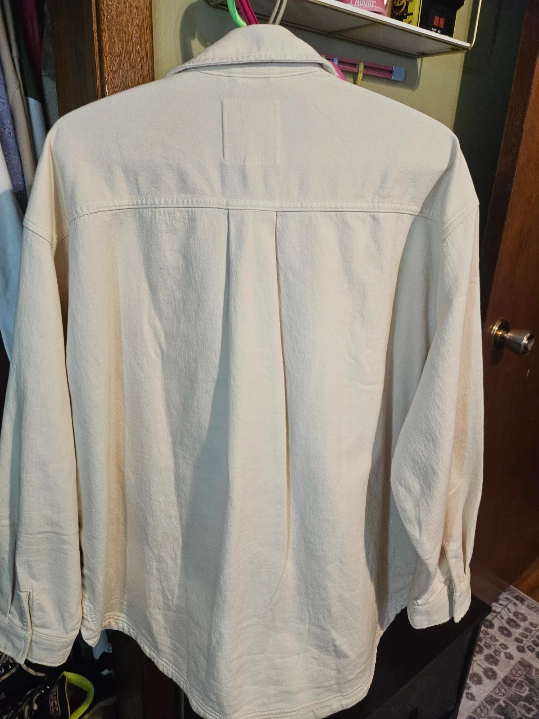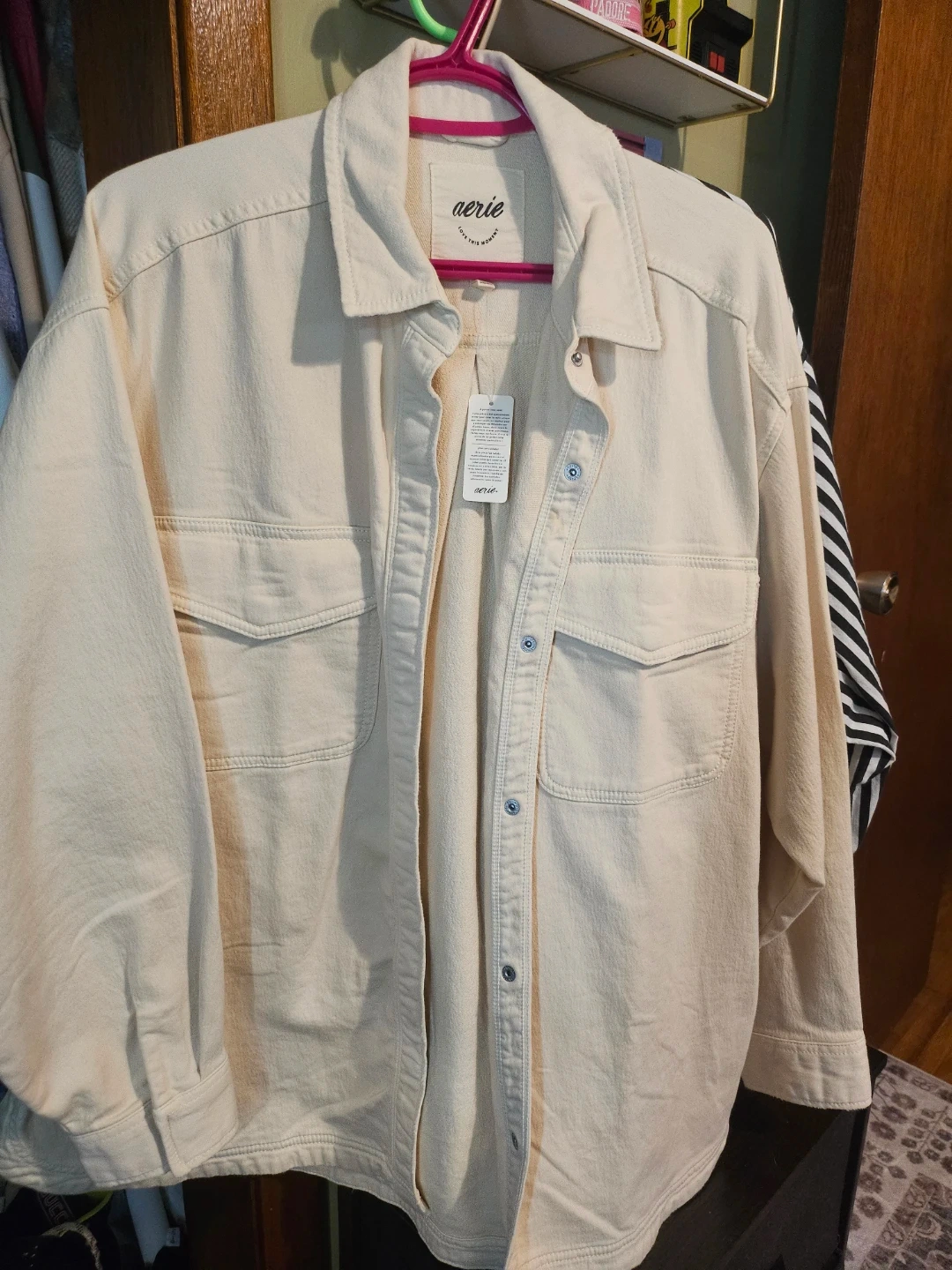 This Aerie shirt jacket is in great condition and ready for a new wardrobe! It's a size M and comes in a versatile beige colour. The tag shows it originally retailed for $74.95 CAD, so you're getting a great deal!
