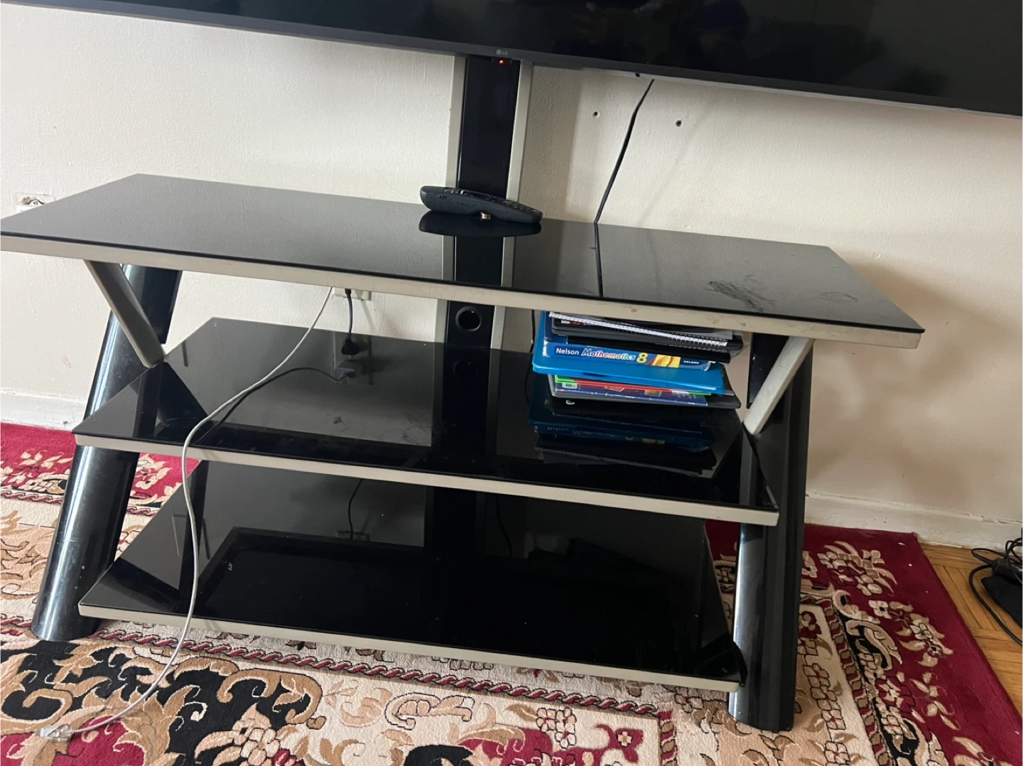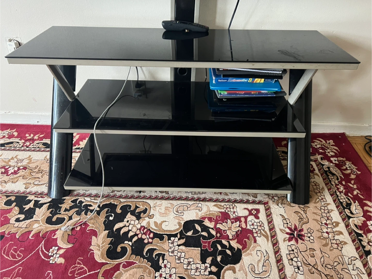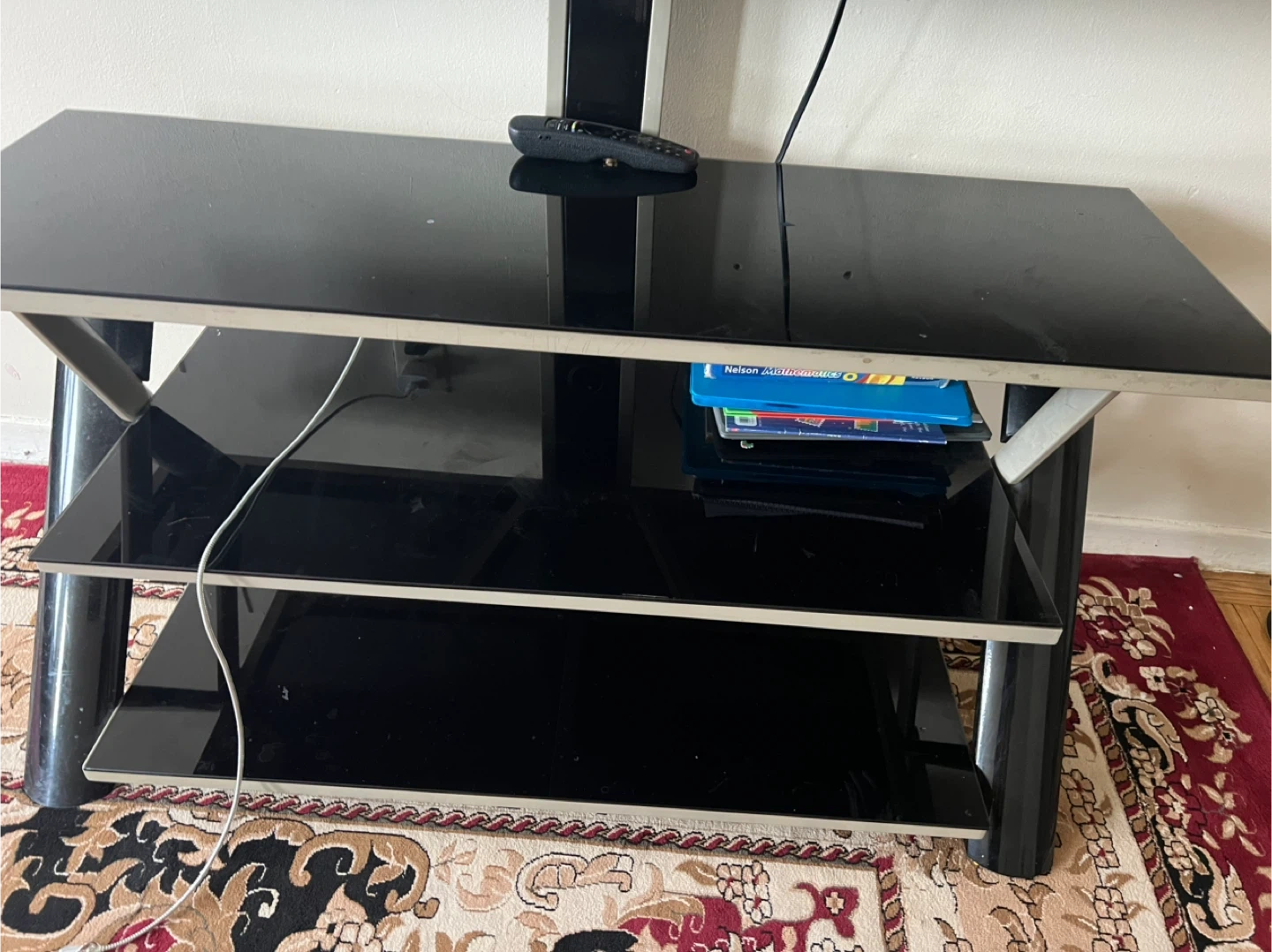 Selling a black glass TV stand. It has three shelves and is in good condition. Perfect for your living room or entertainment area!