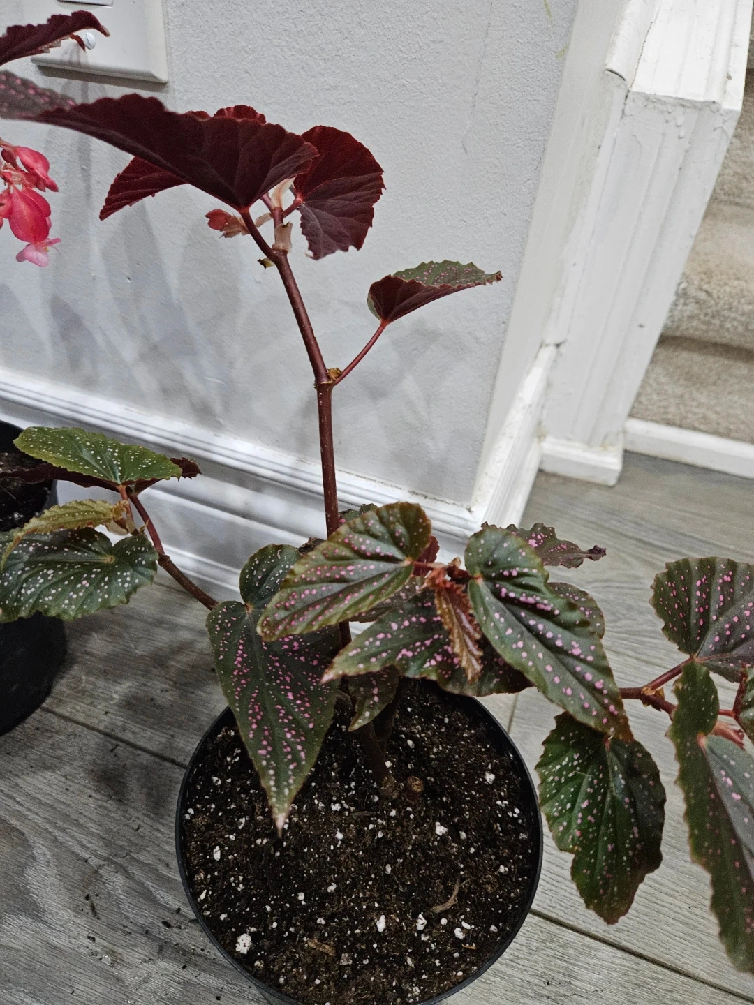 This is a beautiful Maculata pink spot begonia plant! It has lovely green and maroon leaves with pink polka dots. The plant is in a black pot and is ready to brighten up your space