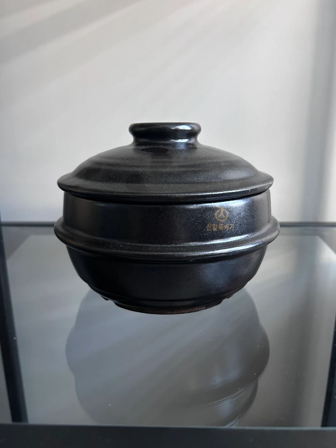 Selling a traditional Korean stone pot with a lid. It's in great shape and perfect for cooking and serving stews or rice dishes. The pot is black and has a classic design that will look great in any kitchen.