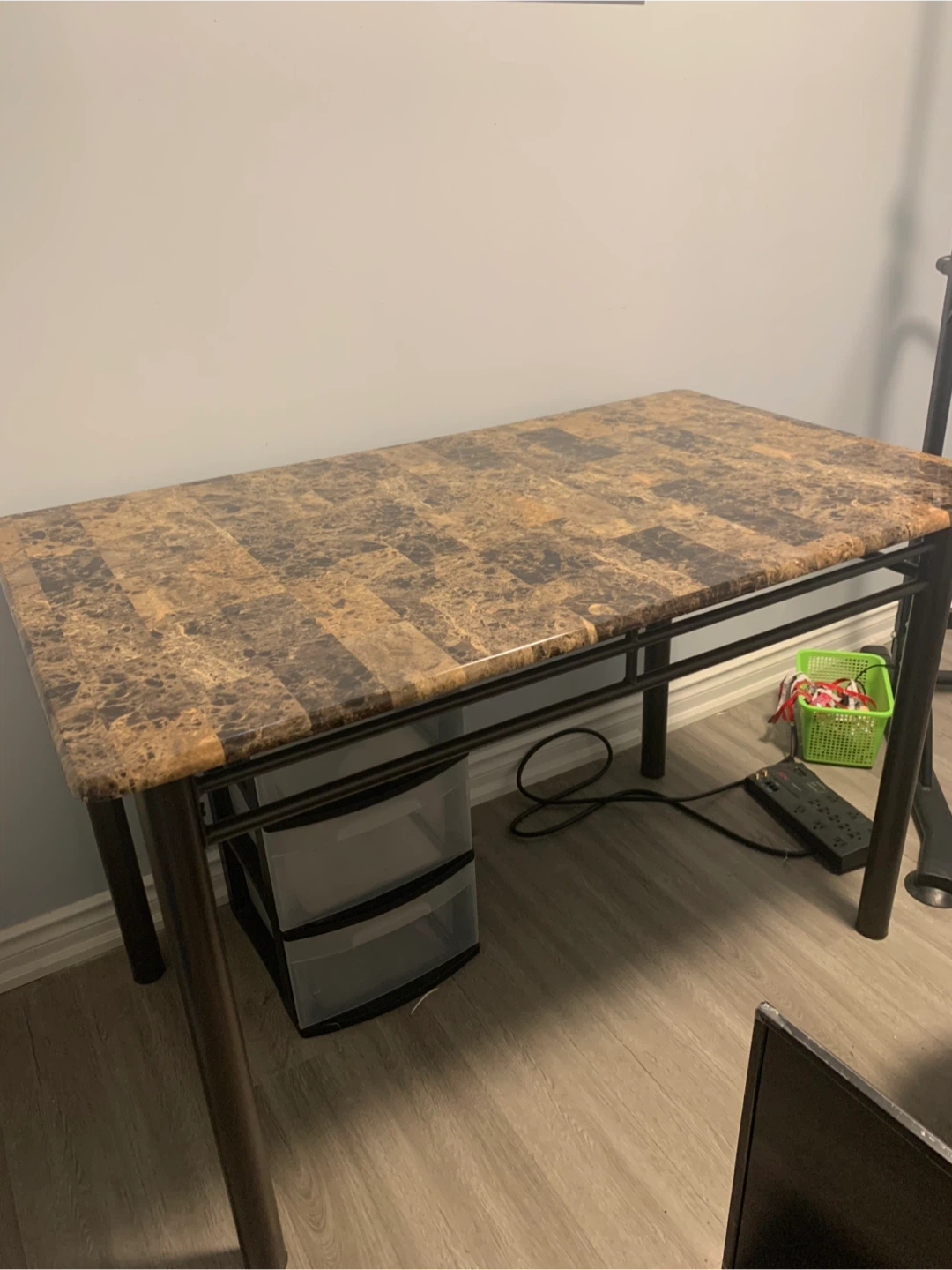 Selling this desk with a brown marble-look top! It has a simple, modern design. Perfect for a home office or study space