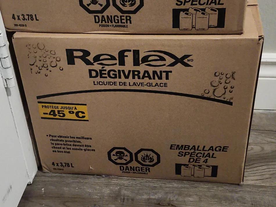 Selling a box of Reflex Degivrant windshield washer fluid. This is a 4-pack, with each container holding 3.78L. It protects down to -45°C, so it's perfect for those cold Canadian winters!