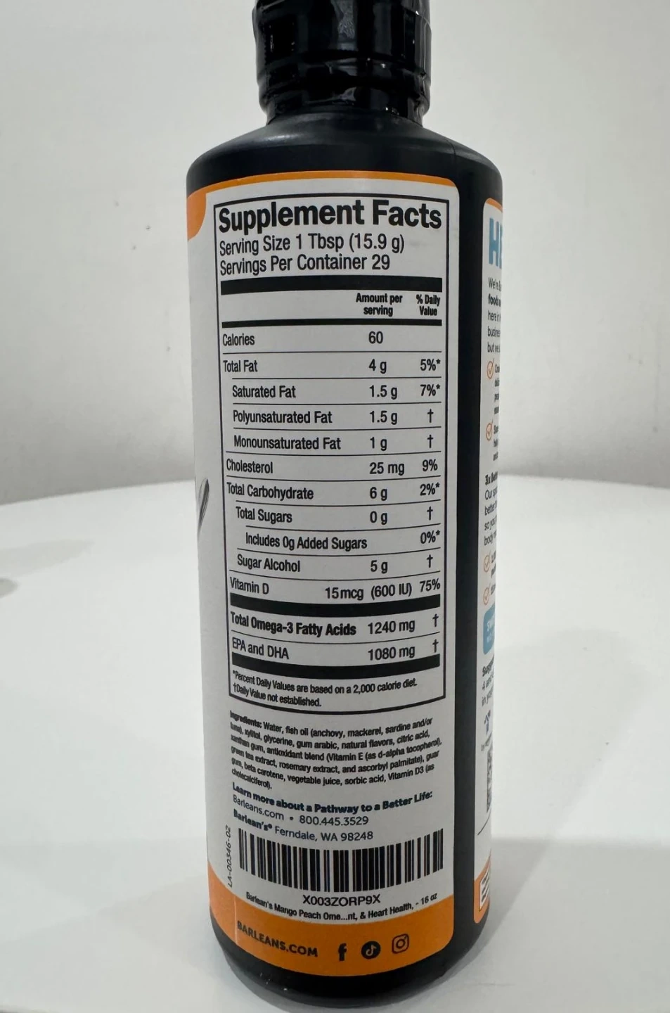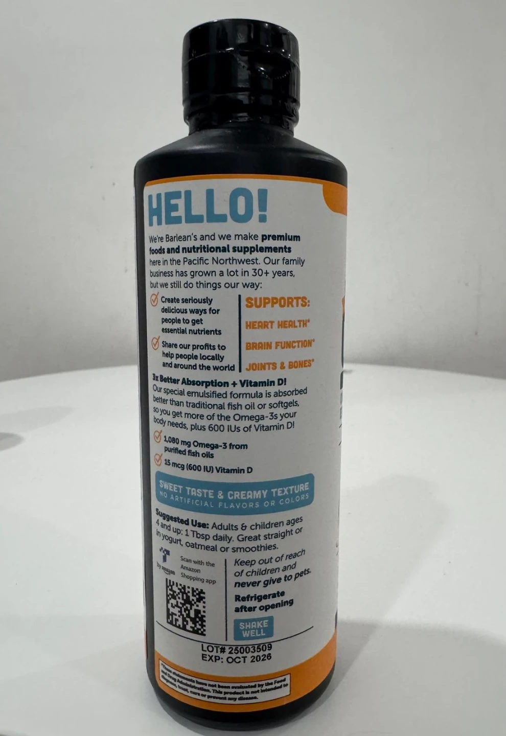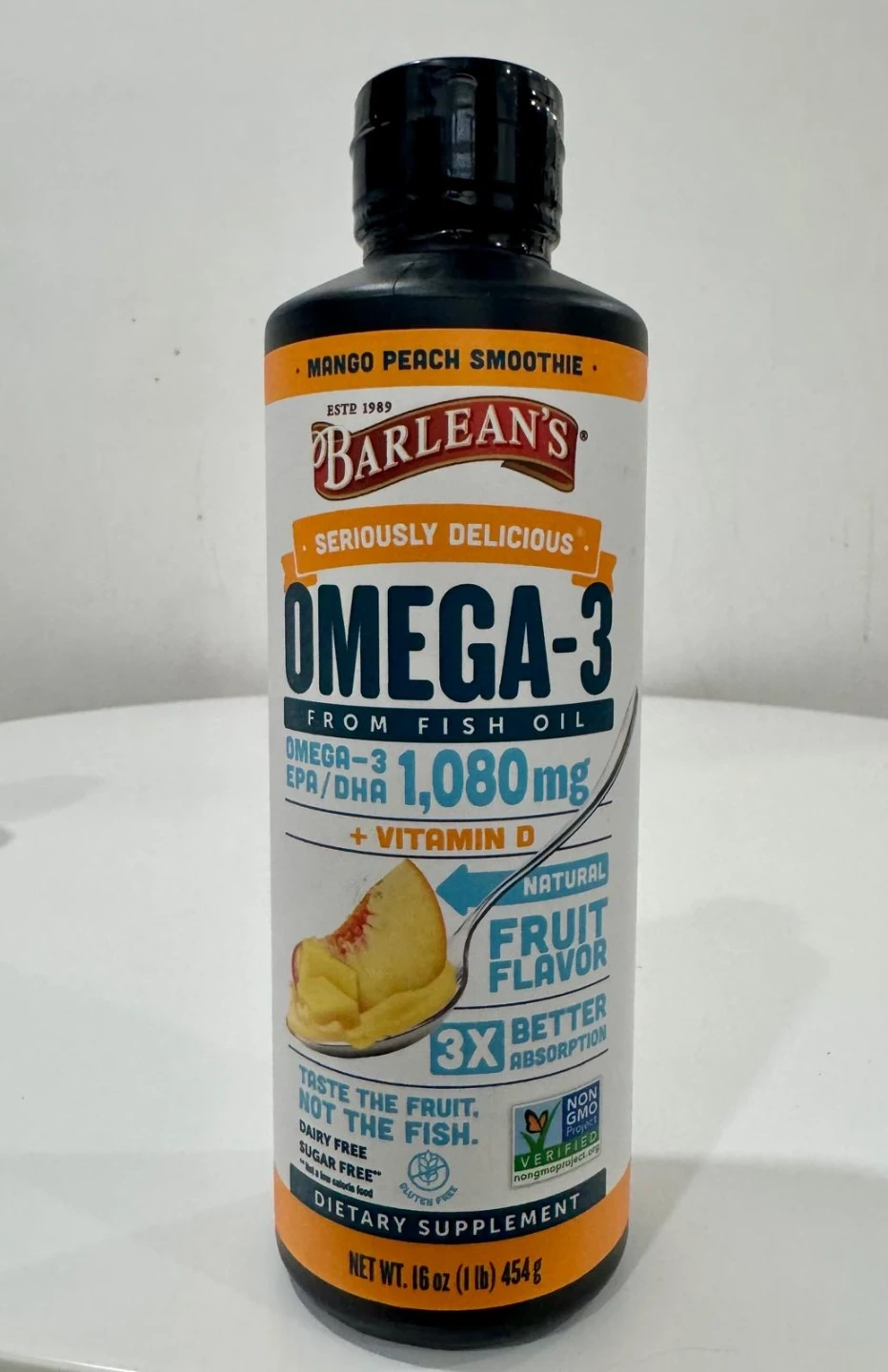 Selling a bottle of Barlean's Omega-3 Mango Peach Smoothie dietary supplement. It's seriously delicious and provides 1,080mg of Omega-3 with EPA/DHA plus Vitamin D. Tastes like fruit, not fish!