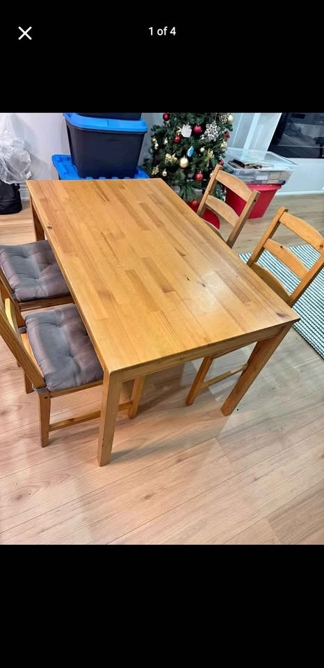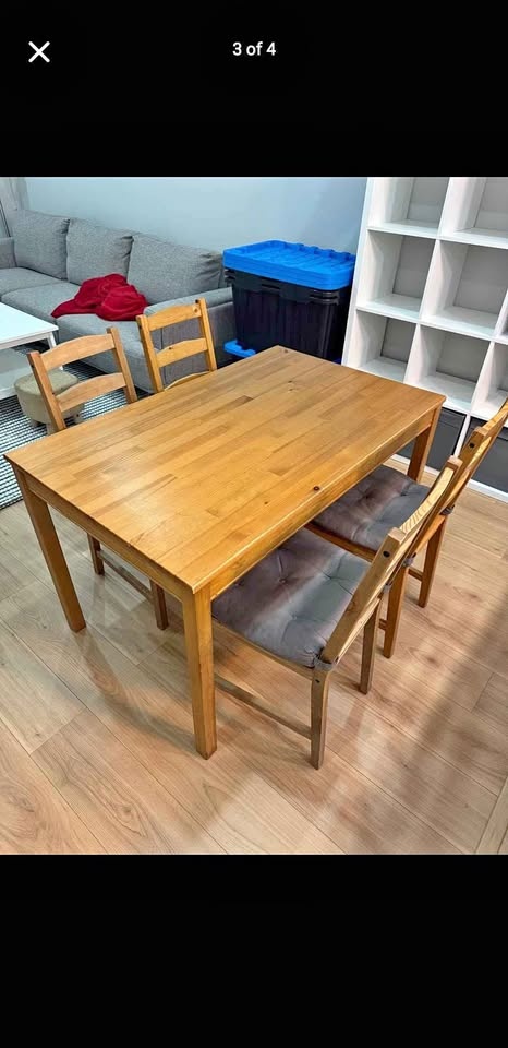 Selling a solid wood dining table with 4 wooden chairs in good condition.