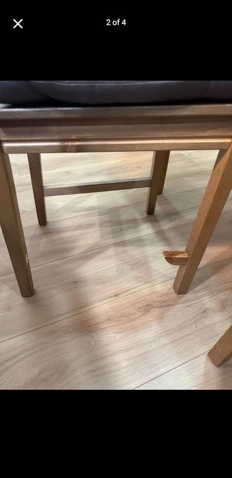 One chair has a visible wood chip / cosmetic damage (shown in pictures). Chair is fully usable and does NOT need repair.