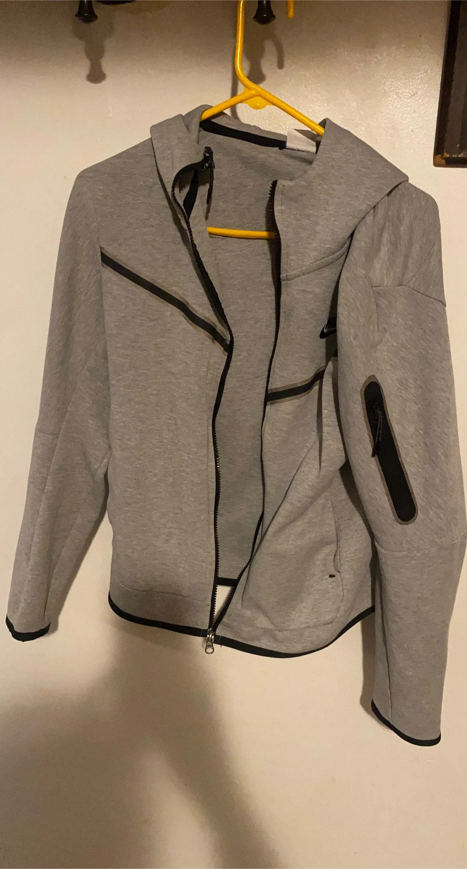 Selling a gray Nike Tech Fleece hoodie. It's in great condition and perfect for layering or wearing on its own. The sleek design and comfortable fit make it a stylish and practical addition to your wardrobe