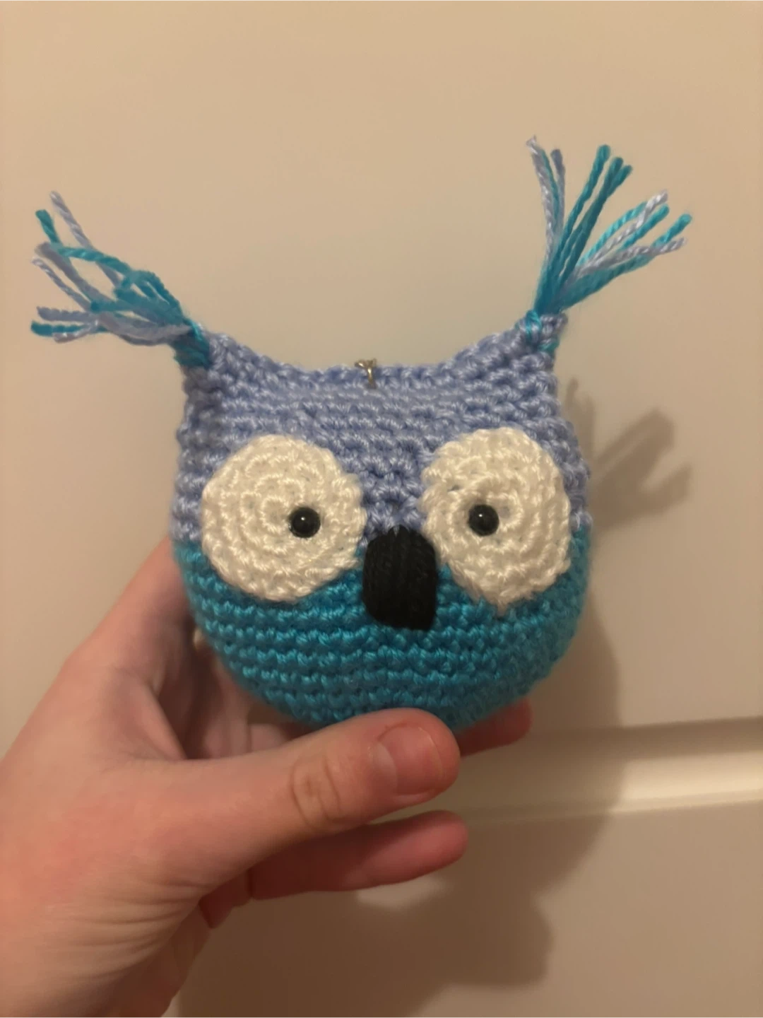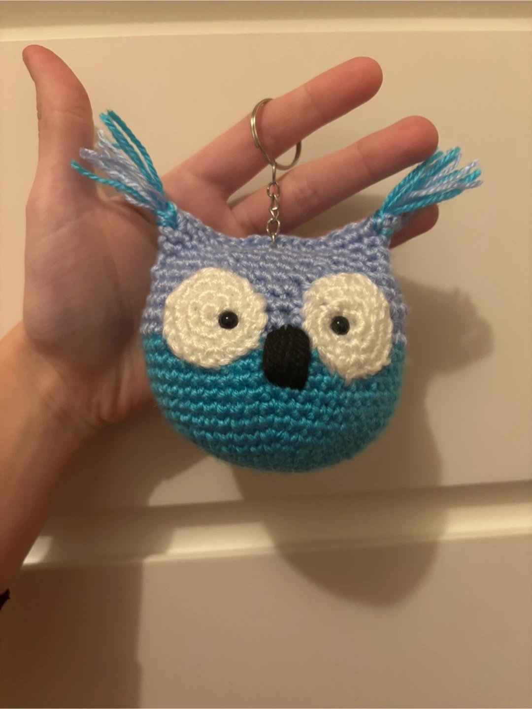 This adorable crocheted owl keychain is looking for a new home! It's handmade with love and care. The owl features a charming design with blue and white colours, perfect for adding a touch of whimsy to your keys or bag