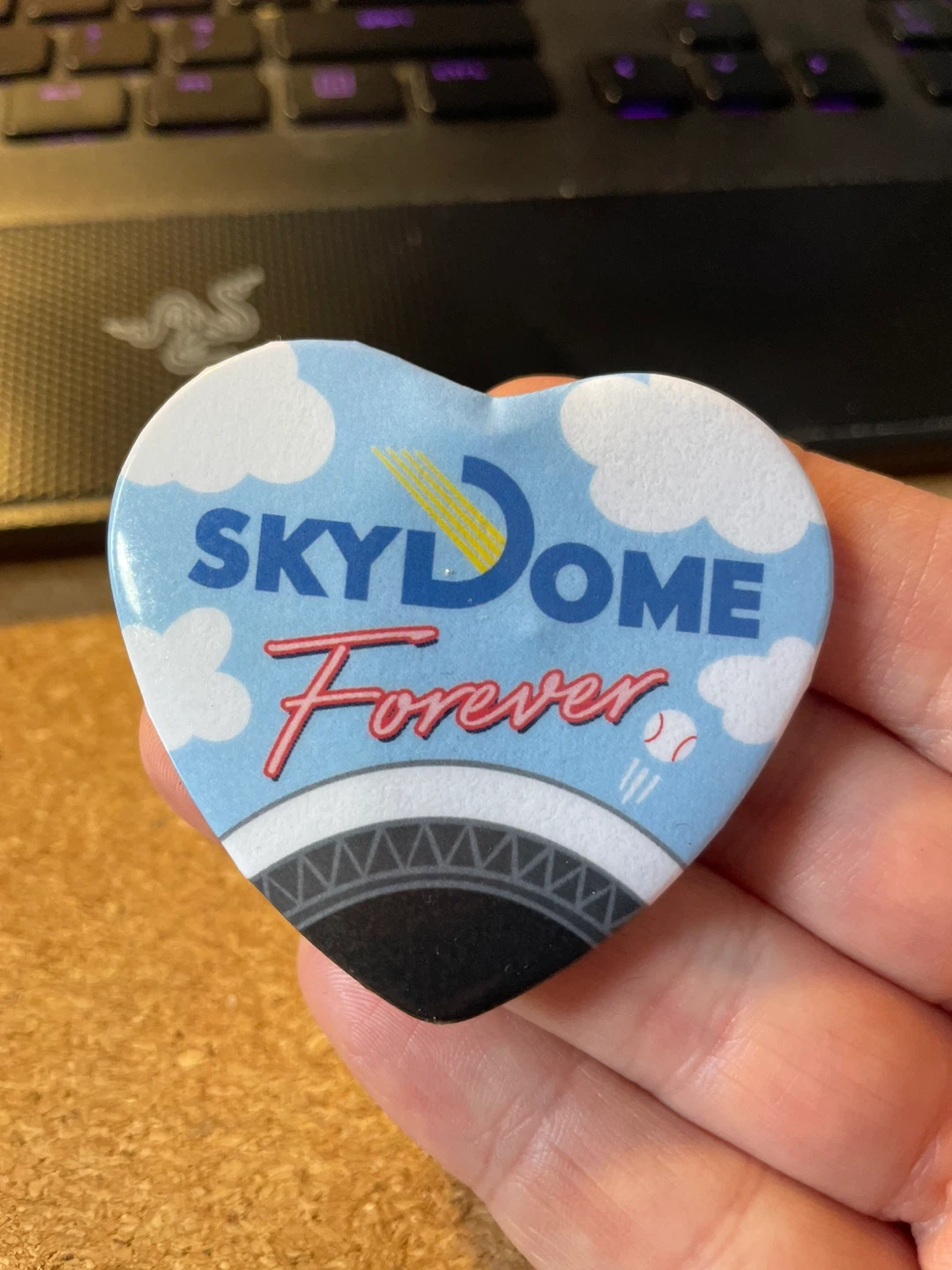 Selling a heart-shaped pin that says "Skydome Forever"! New, but this one didn’t press properly when I made it so it has a couple dents on it, so I’m giving it away for free.