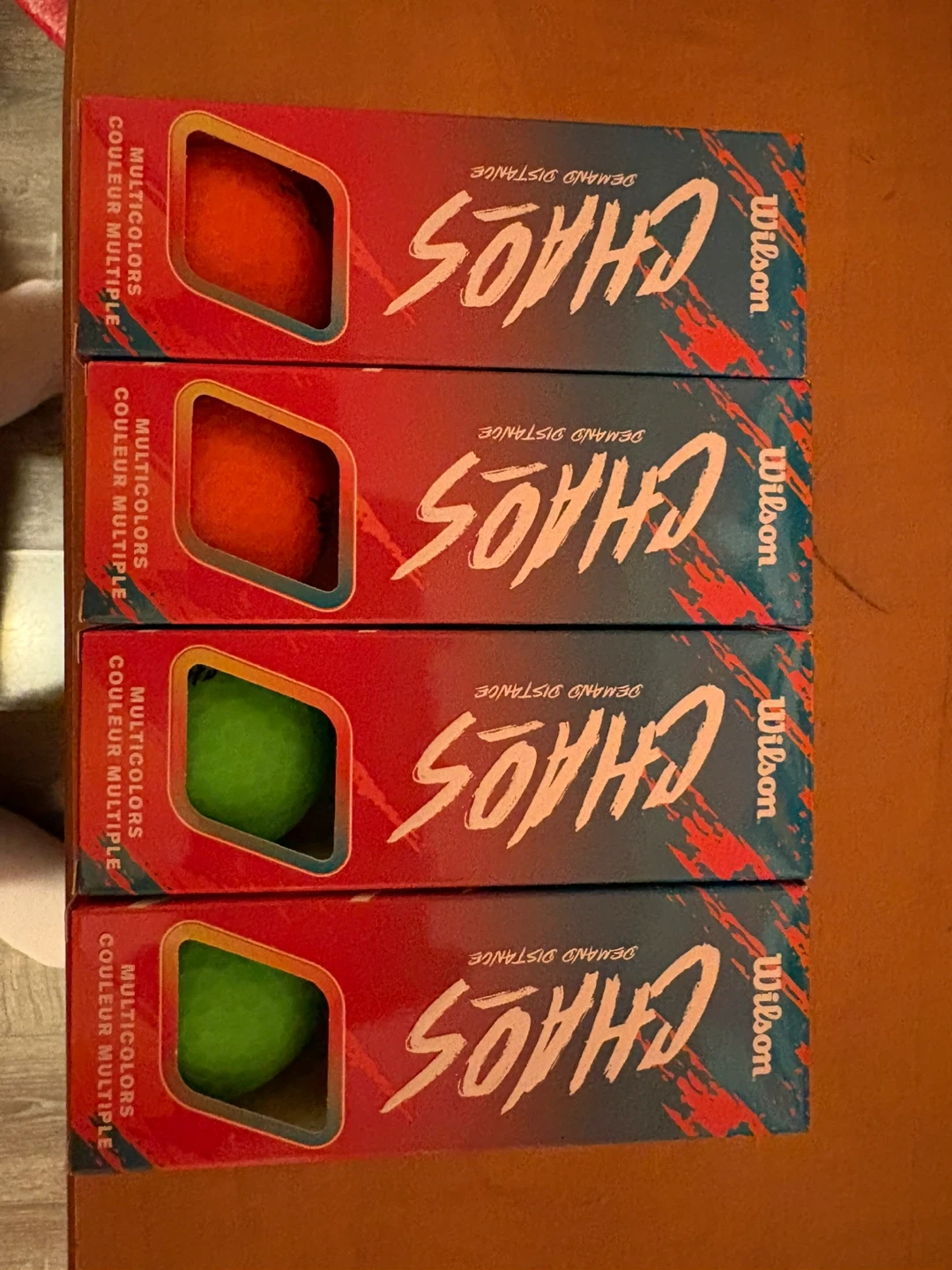 Selling a set of Wilson Chaos golf balls in multicolors! These golf balls are designed for demand distance and come in a vibrant mix of colours. Perfect for adding some fun to your game on the green!