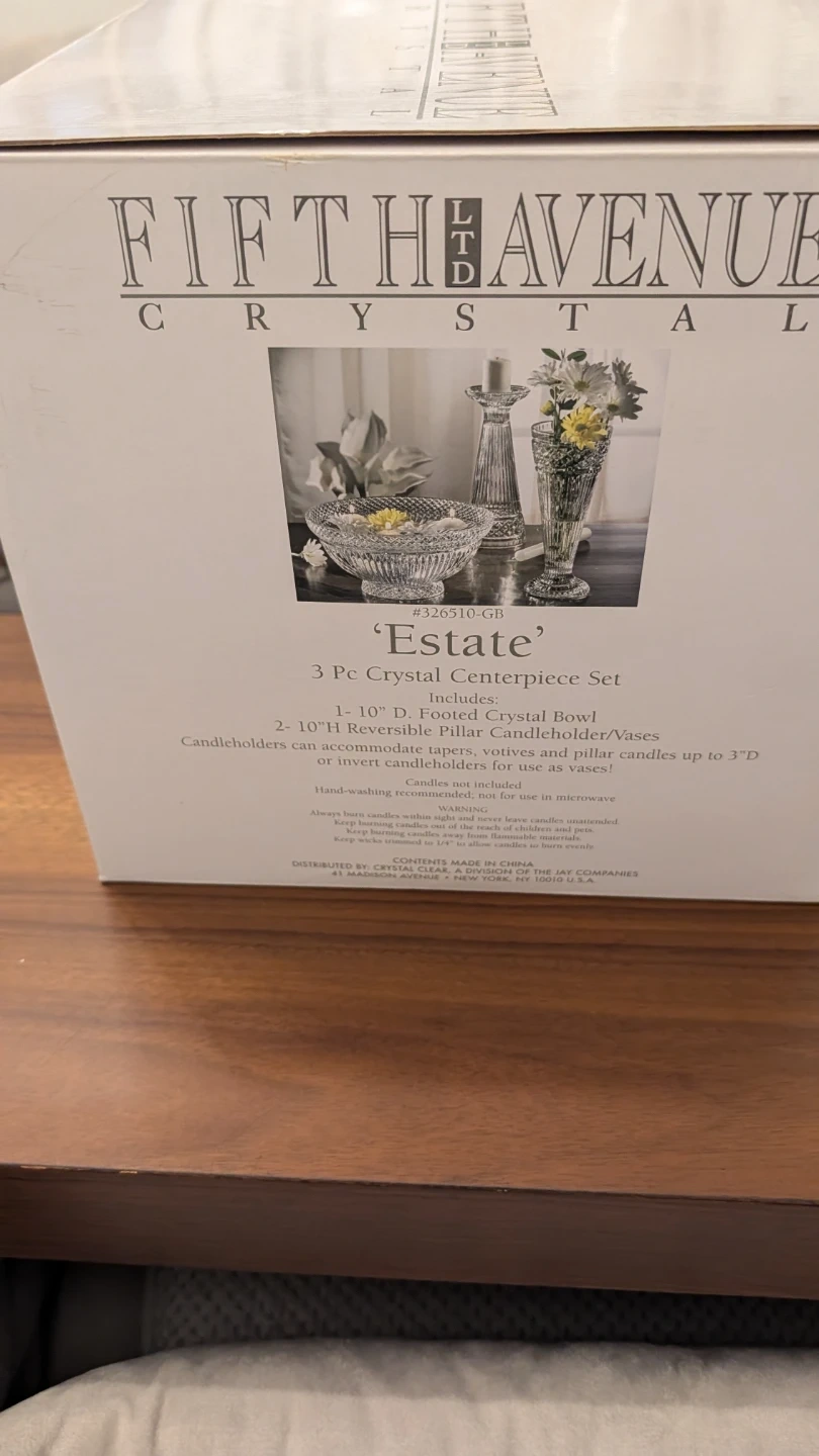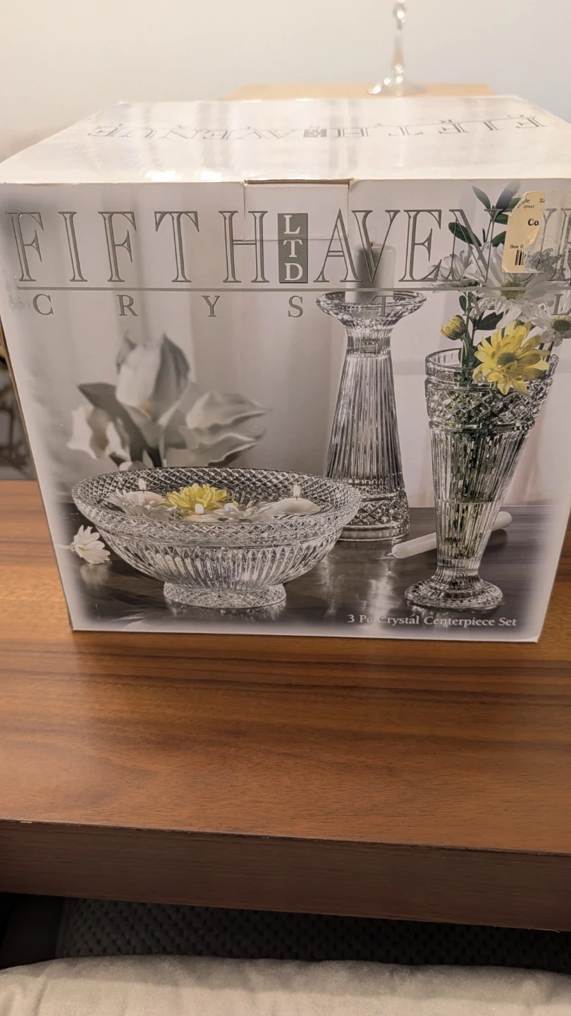 Selling a brand new Fifth Avenue Crystal 'Estate' 3-piece centerpiece set. It includes a 10" D. footed crystal bowl and two 10" reversible pillar candleholder/vases. The candleholders can accommodate taper, votive, or pillar candles up to 3"D or invert candleholders for use as vases! The box is included