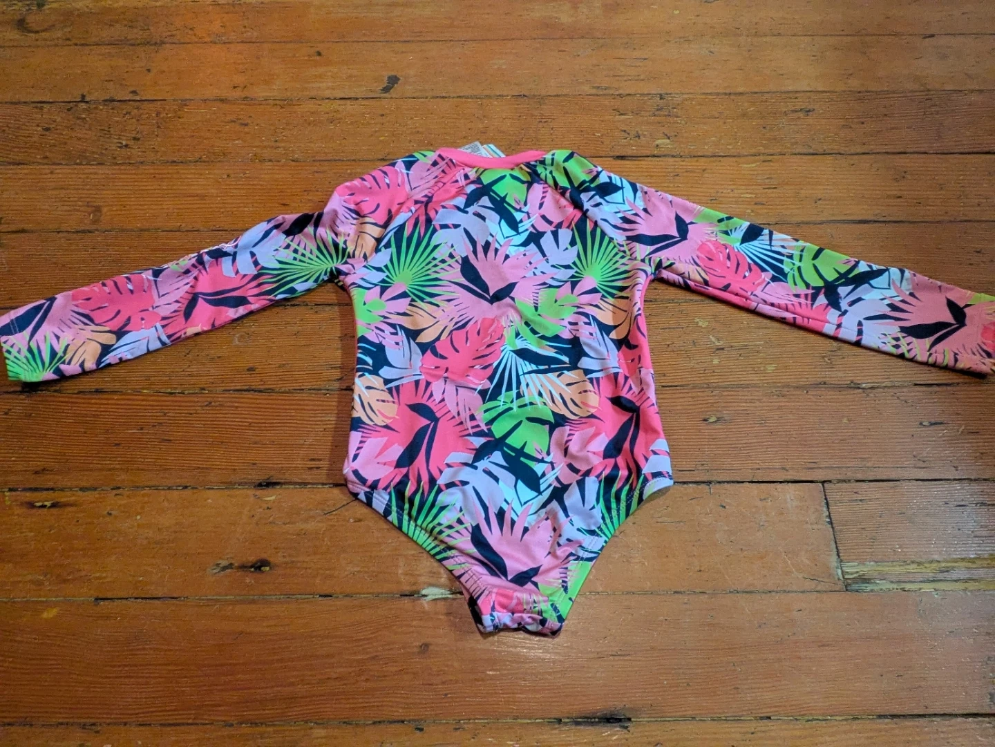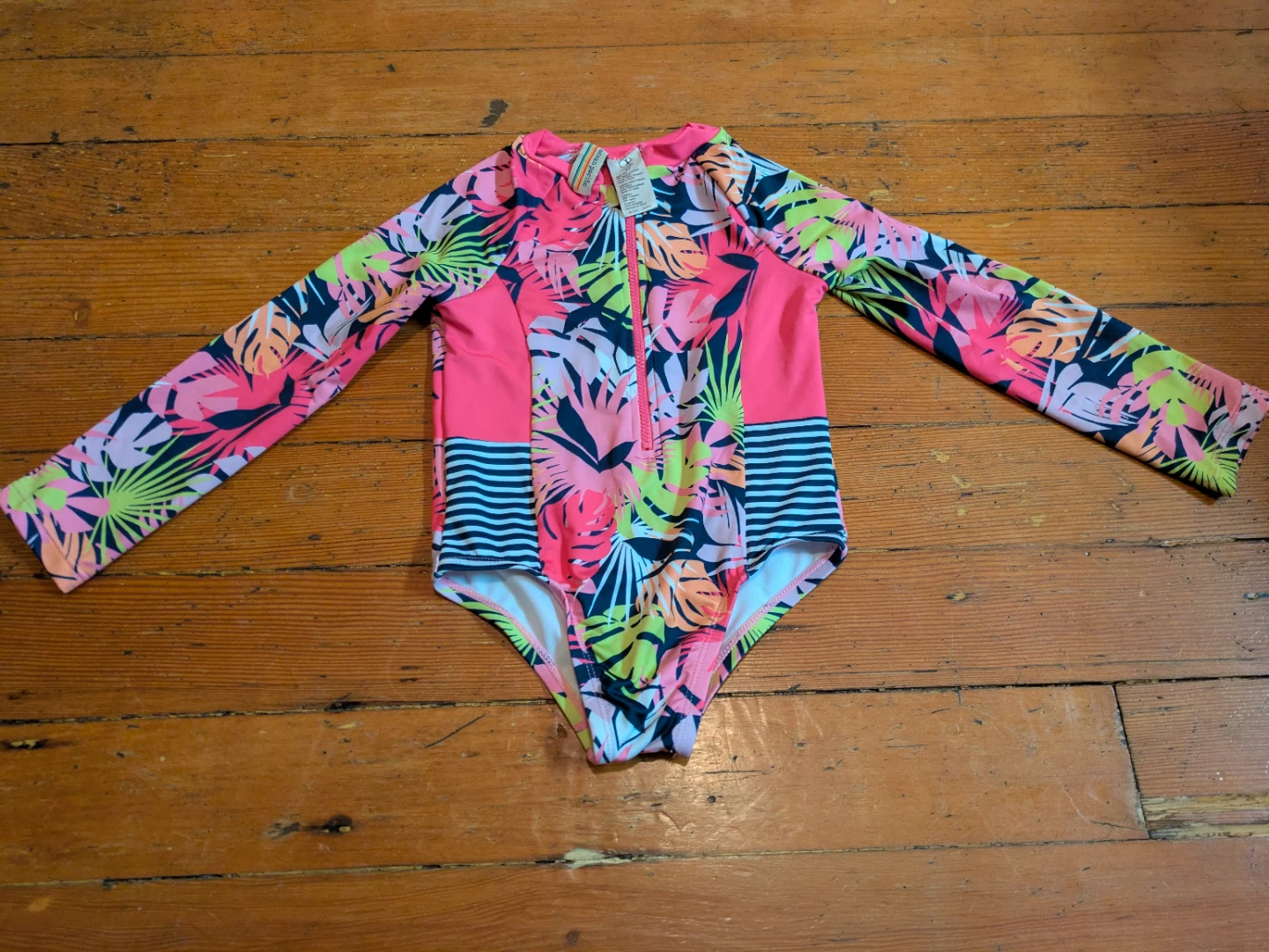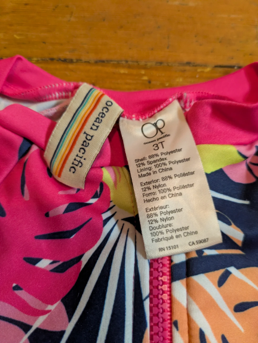 This adorable Ocean Pacific swimsuit is perfect for your little one! It's a size 3T and features a vibrant tropical print. The swimsuit has long sleeves for extra sun protection. Made with 88% polyester and 12% spandex for a comfy fit!