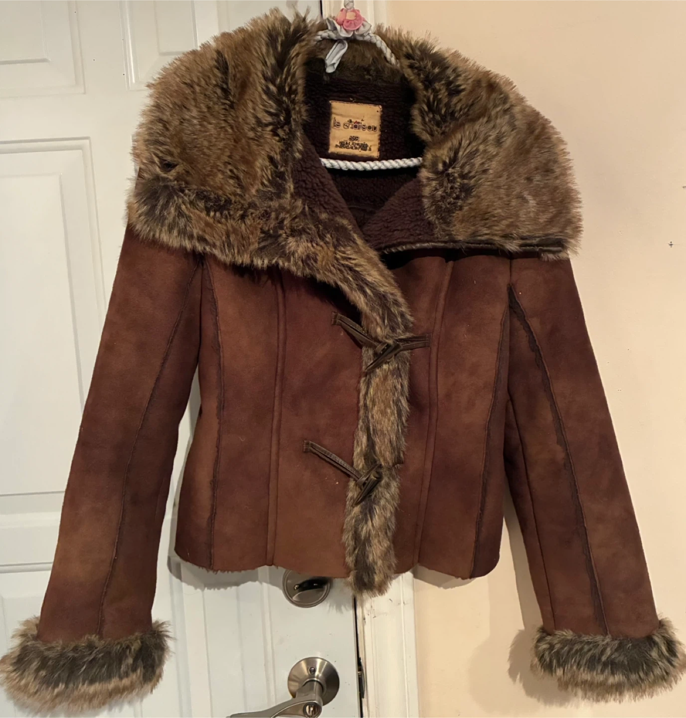 Cozy up in this Le Chateau jacket! It features a faux suede exterior in a rich brown colour, complemented by faux fur trim. Perfect for adding a touch of warmth and style to your outfit. Machine washable. Size small.