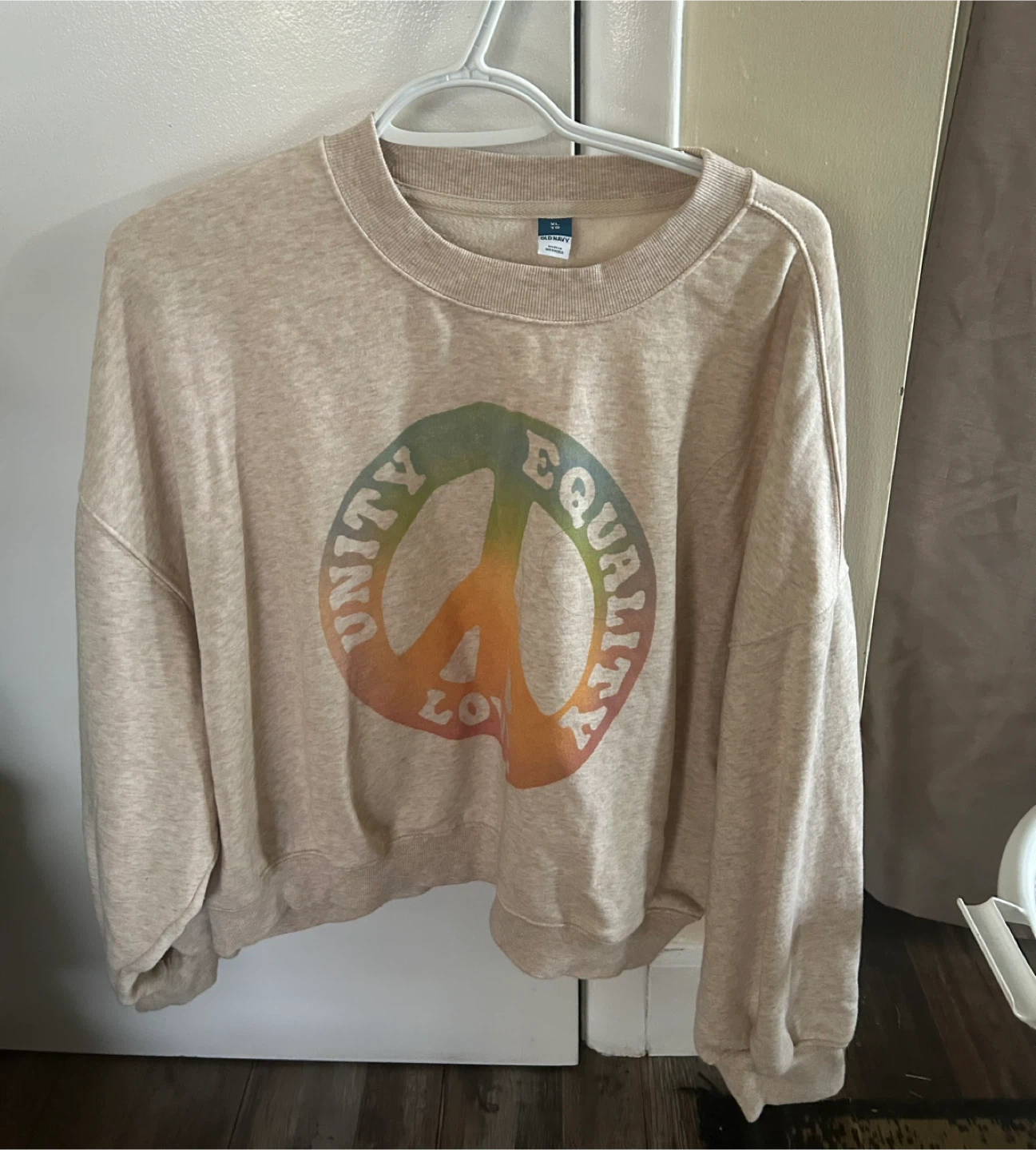 Cozy Old Navy sweatshirt in size XL! It's a beige colour with a graphic design on the front that says 'Unity, Equality, Love'. Perfect for a comfy and casual look