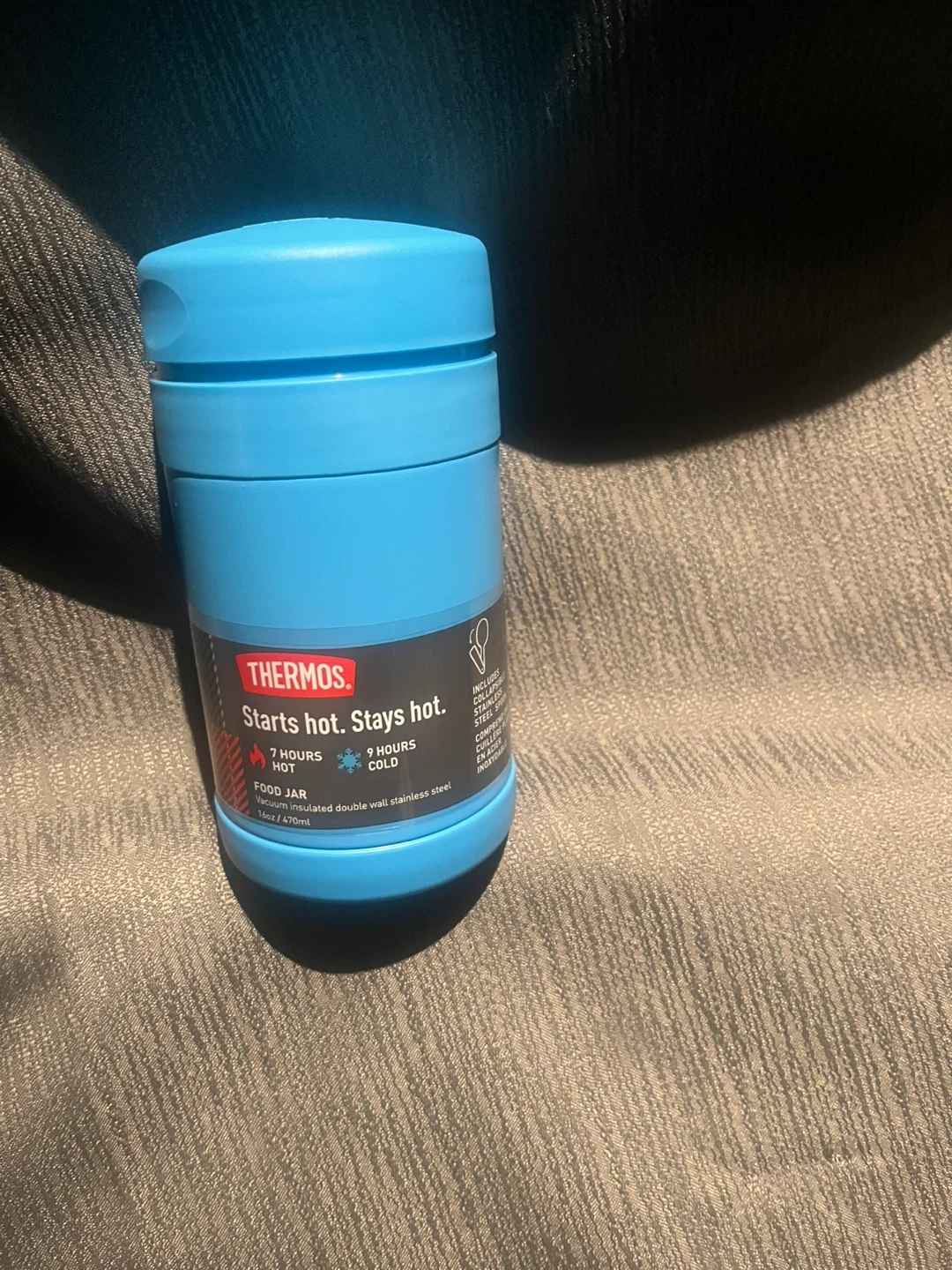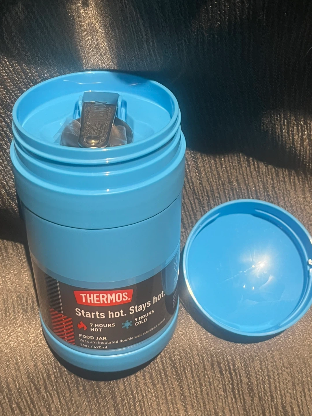 Keep your food hot or cold with this Thermos food jar! It's a 16oz (470ml) vacuum insulated double wall stainless steel container. Stays hot for 7 hours and cold for 9 hours