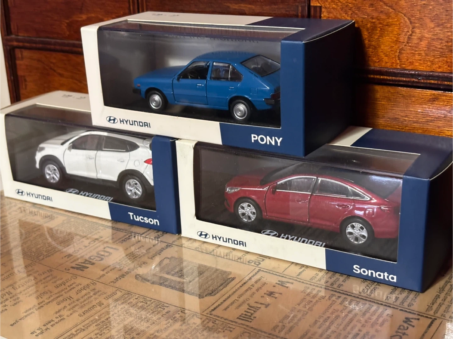 Selling a collection of Hyundai mini cars, including the Pony, Tucson, and Sonata models. These are genuine Hyundai parts and come in their original boxes. Perfect for collectors or Hyundai enthusiasts!