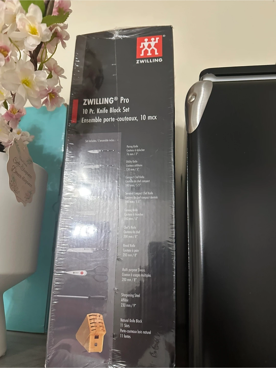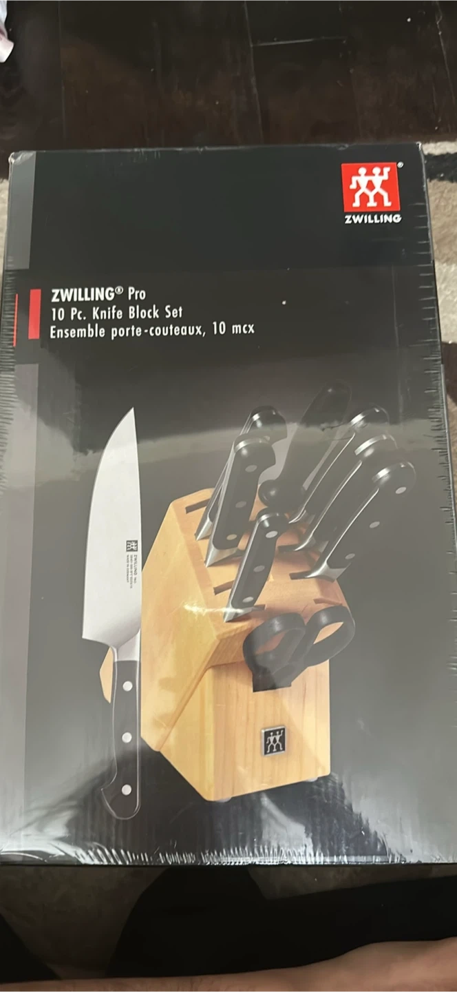 Selling a brand new Zwilling Pro 10-piece knife block set! This set includes a paring knife, utility knife, compact chef's knife, serrated compact knife, carving knife, chef's knife, bread knife, multi-purpose shears, sharpening steel, and a natural knife block with 11 slots. The knives are made with high-quality materials for precision and durability. Perfect for any kitchen!