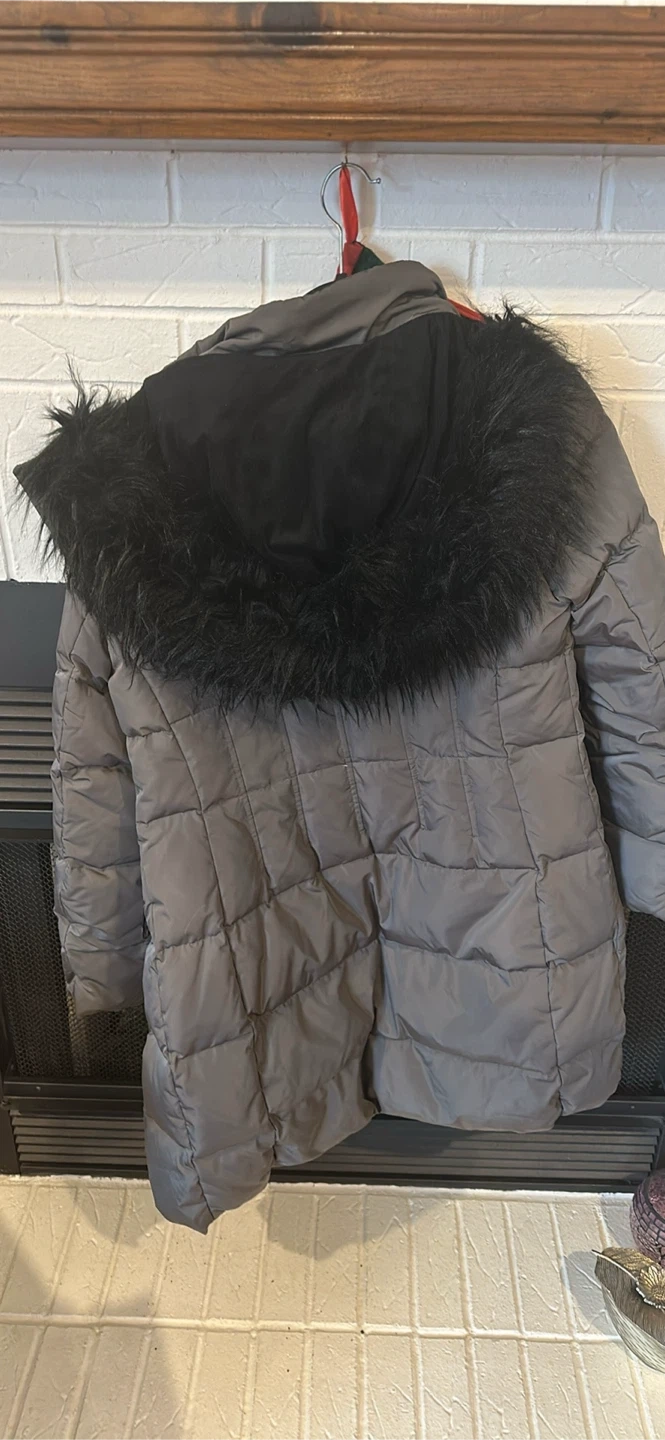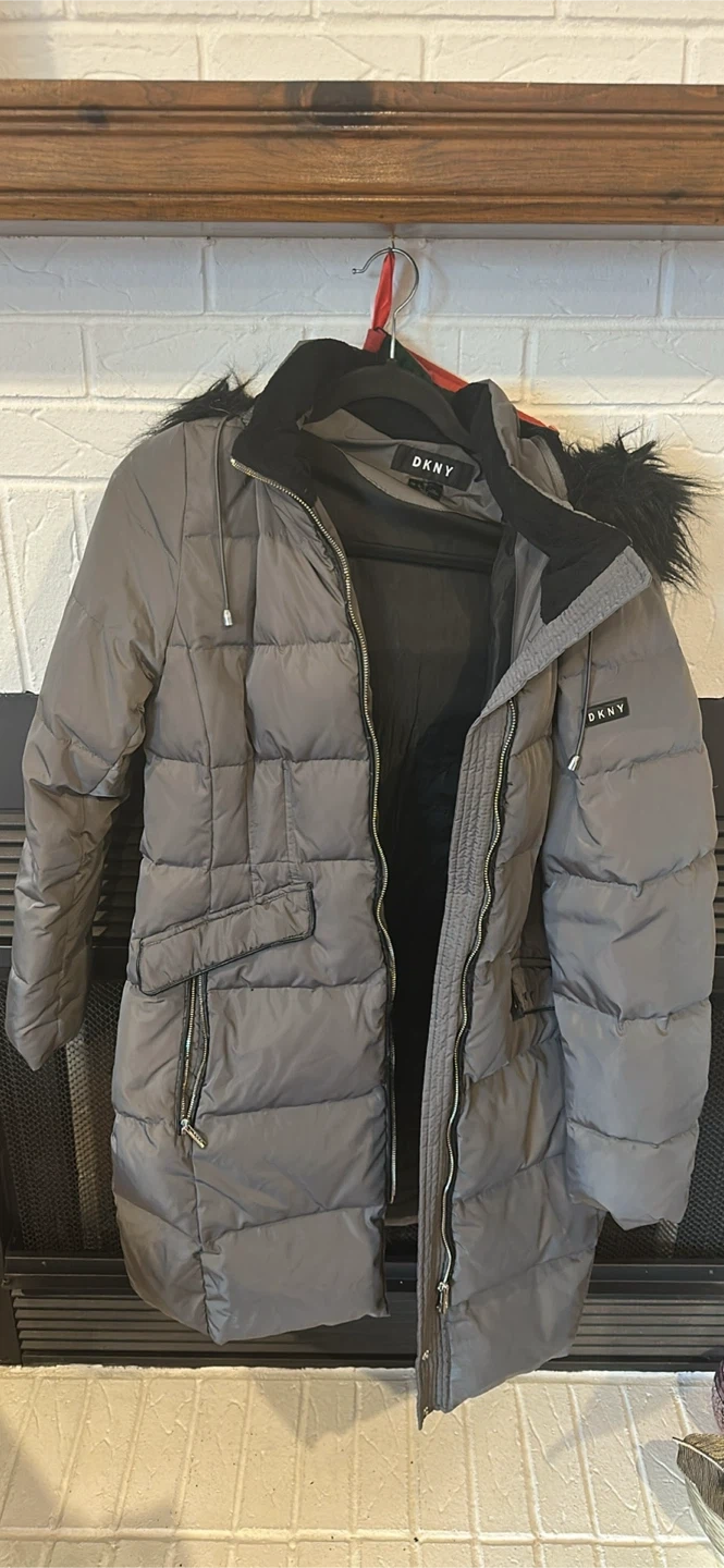 I'm selling a DKNY grey puffer coat. It's in a good condition . Only thr leather around the pockets are peeling. It can be removed