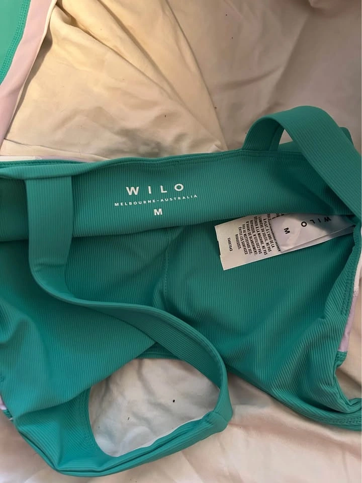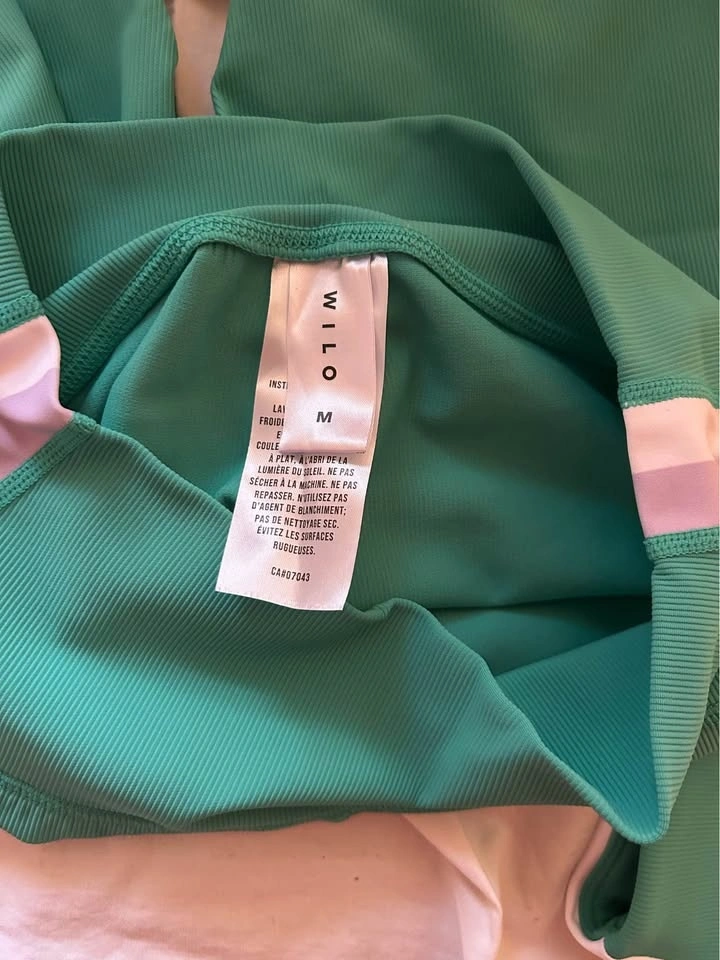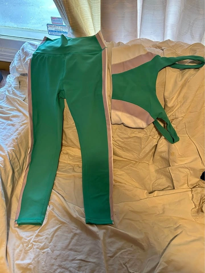 Lovely green colour with white and dusty mauve accents on both pieces. Like new condition. Looks like it fits small.