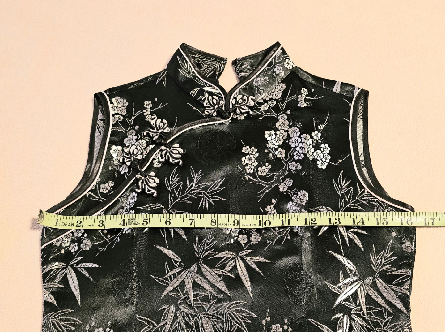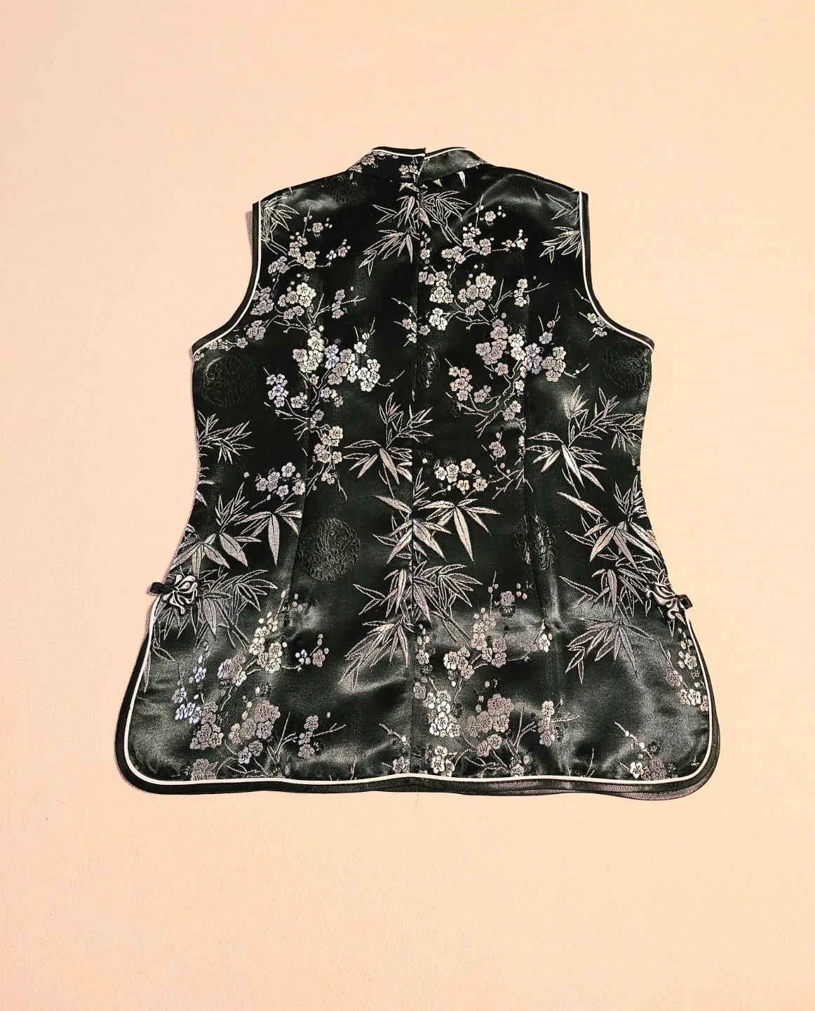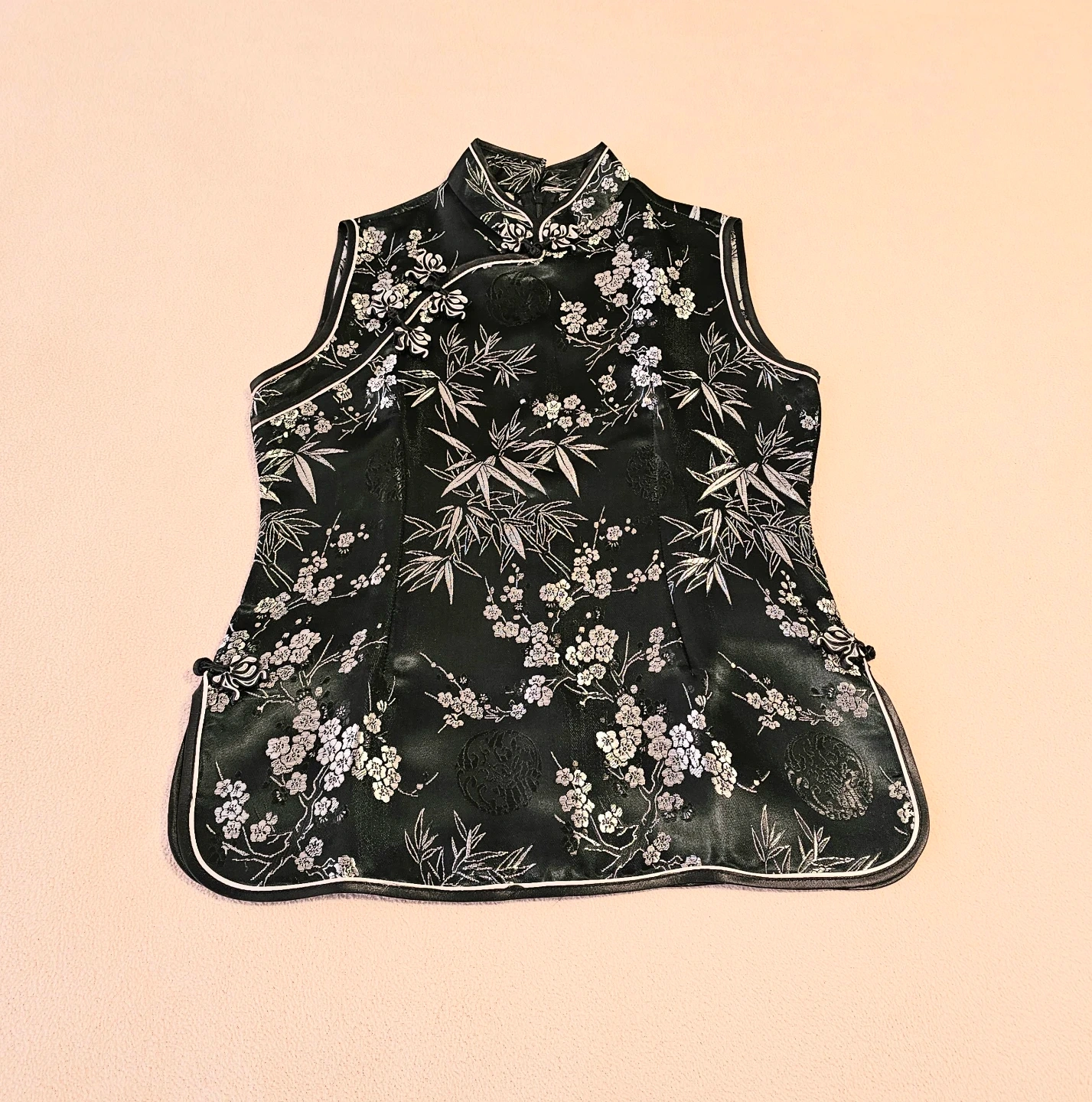 NEW Gorgeous black floral sleeveless cheongsam top! It's in perfect condition and has a unique floral and bamboo design, mandarin collar, frog closures. Size Small. $15