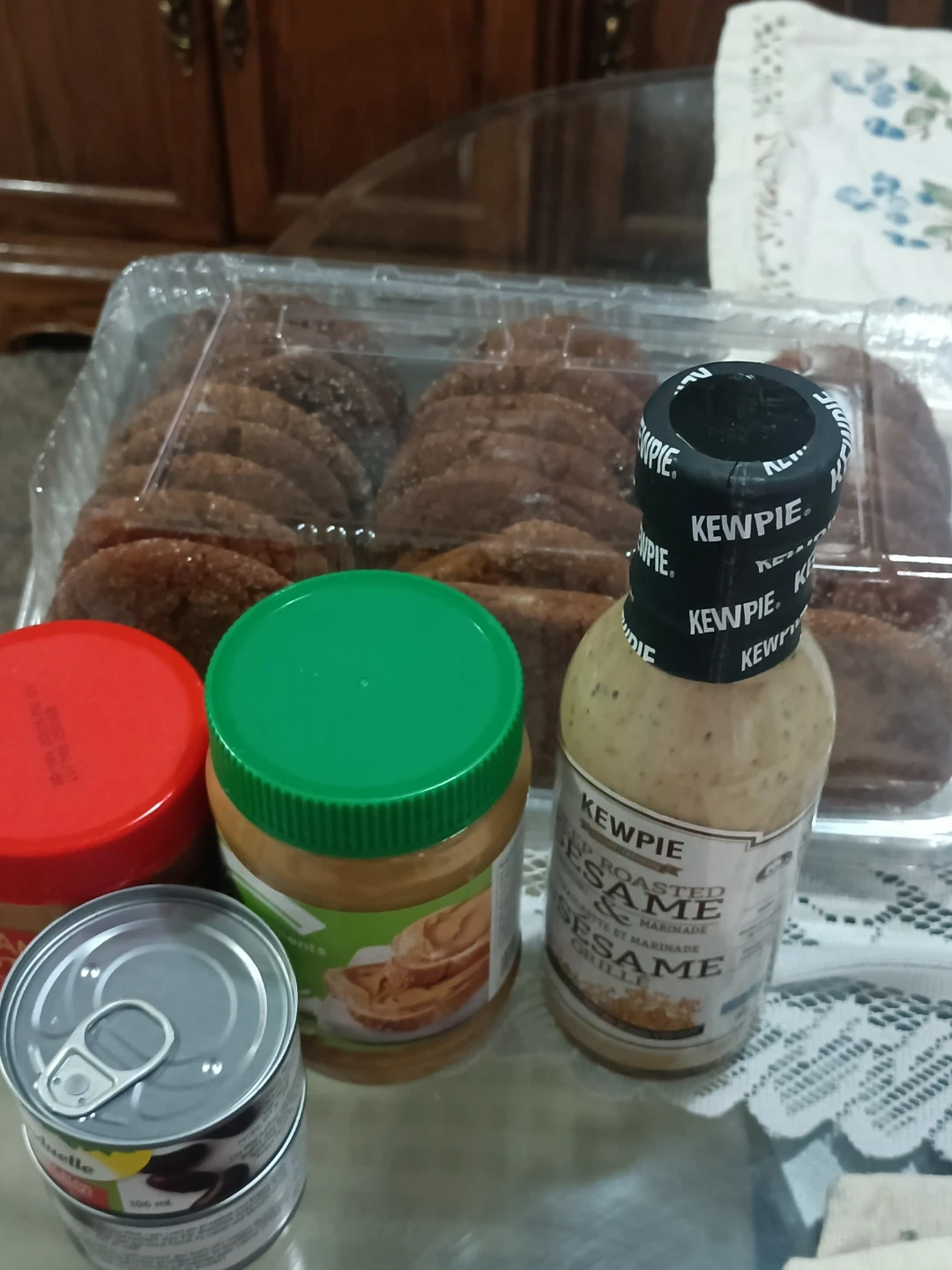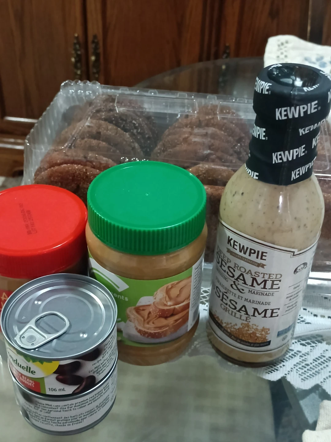 Cookies, seseme dressing, canned beans, and 2 peanut butter.