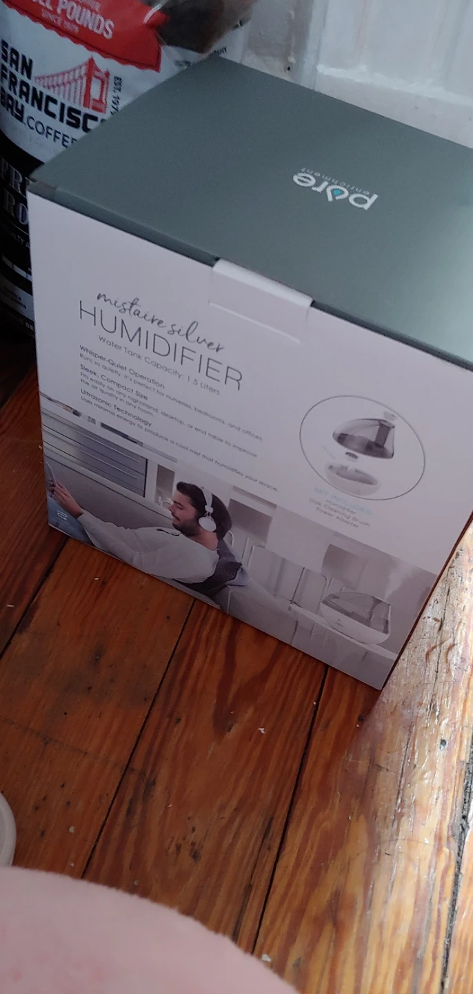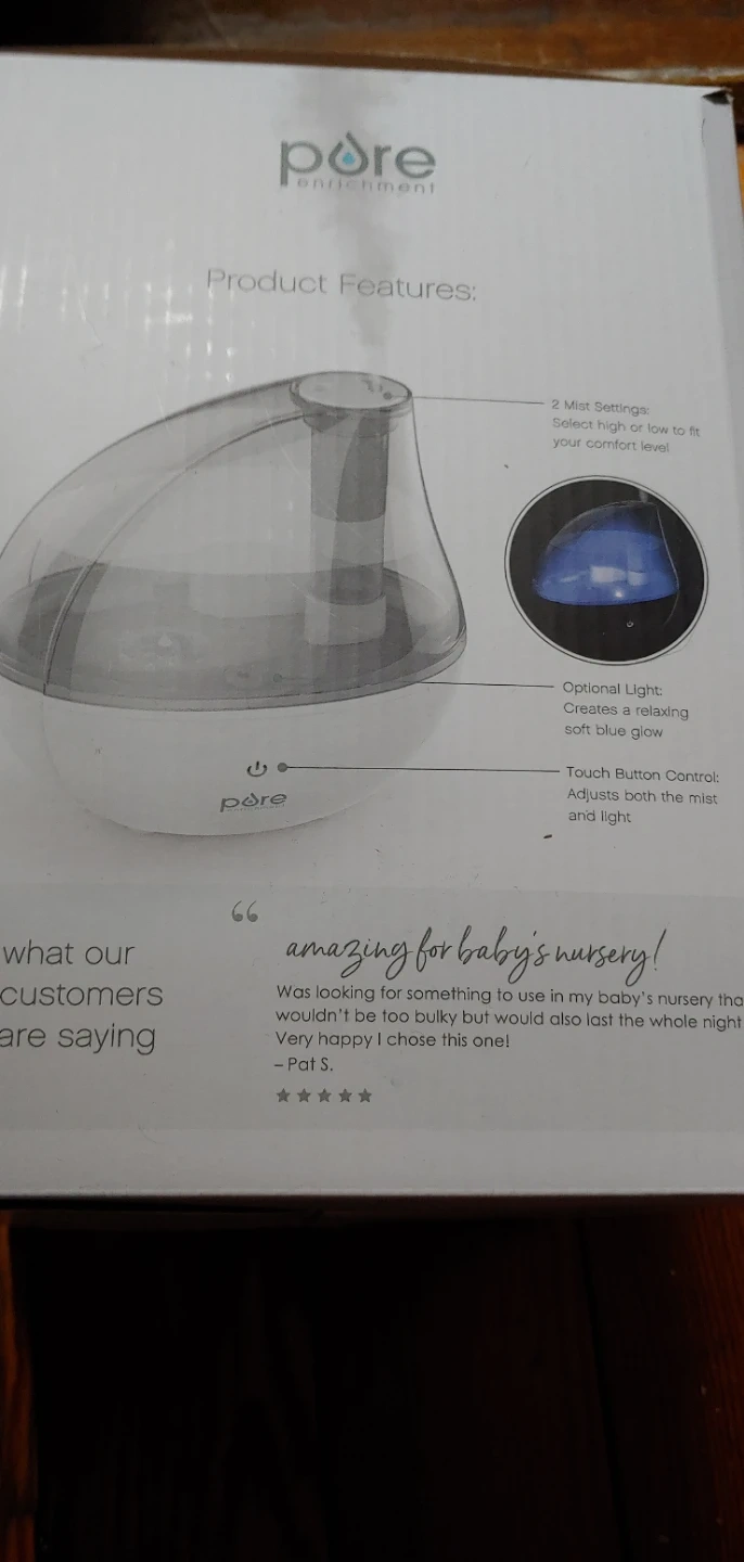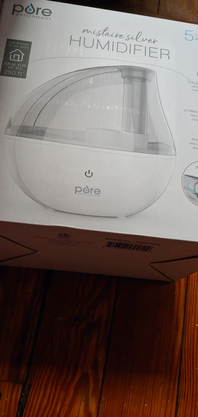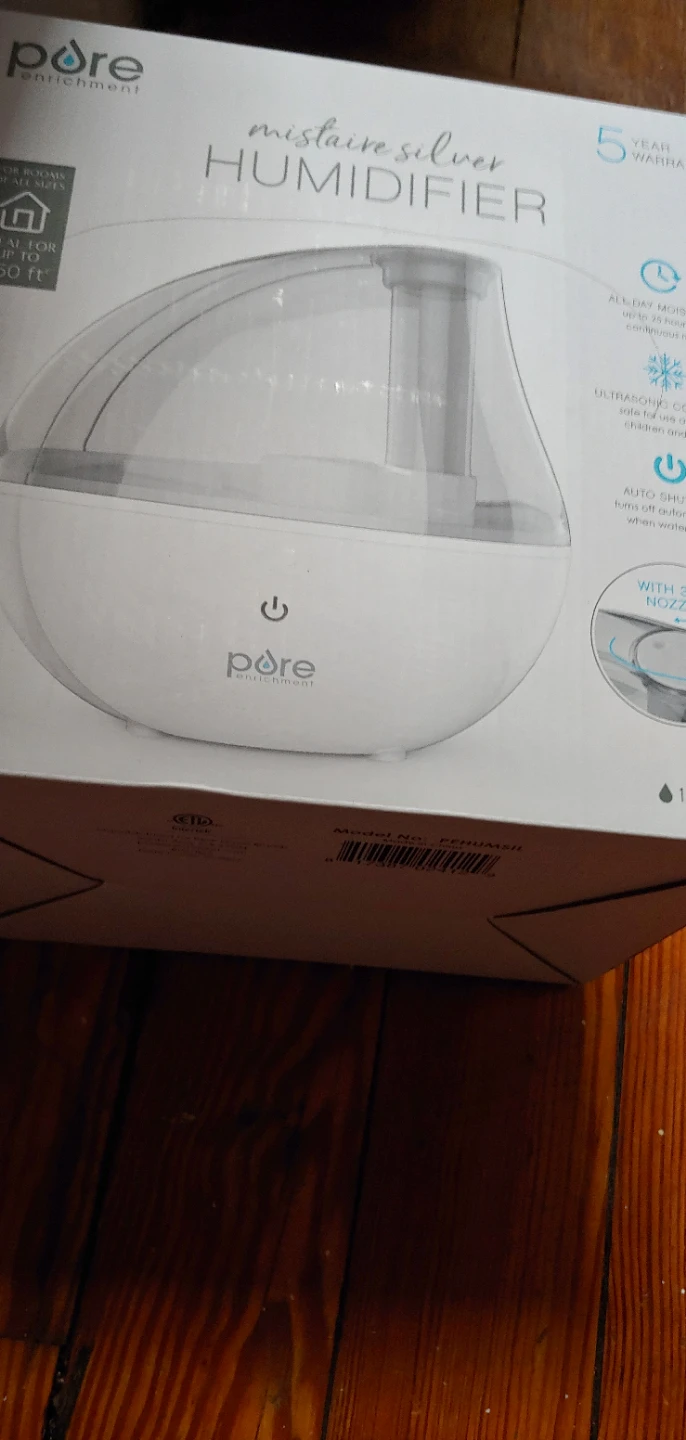Selling a Pure Enrichment MistAire Silver Humidifier. It has whisper-quiet operation and is suitable for bedrooms, nurseries, and offices. It's a compact size, perfect for a desktop, or end table to improve energy levels and create a cool mist and humidifies your space. It also has two mist settings and an optional light that creates a relaxing soft blue glow! The humidifier also has a touch button control that adjusts both the mist and light. Comes with box.Used several times.
