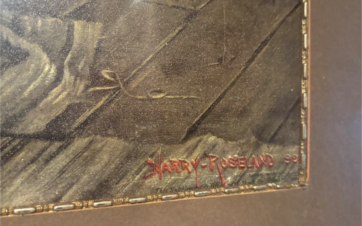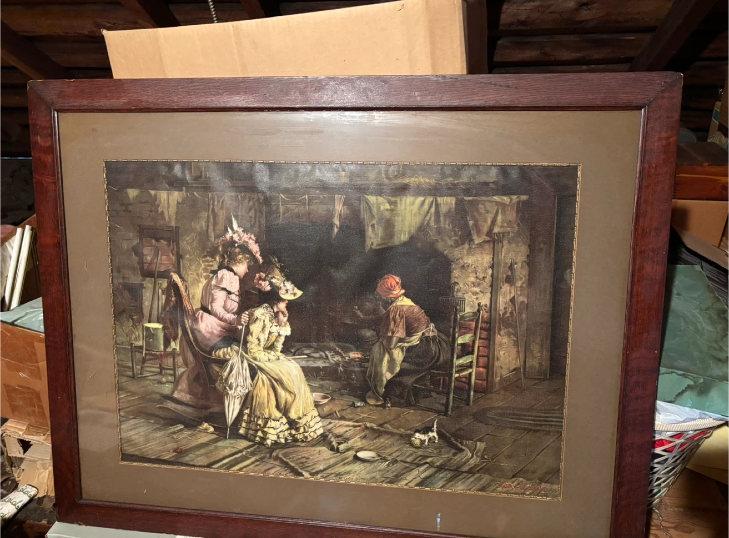 Selling a framed print by Harry Roseland. The print is signed and dated '99. It depicts a scene with women in a rustic interior. i believe it may be called āMixing the Love Potionā. Found in my attic. Not perfect and has some past water damage.