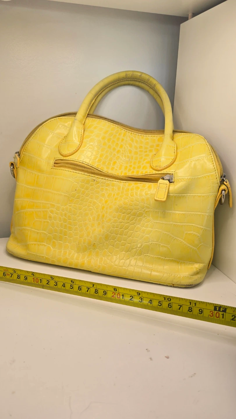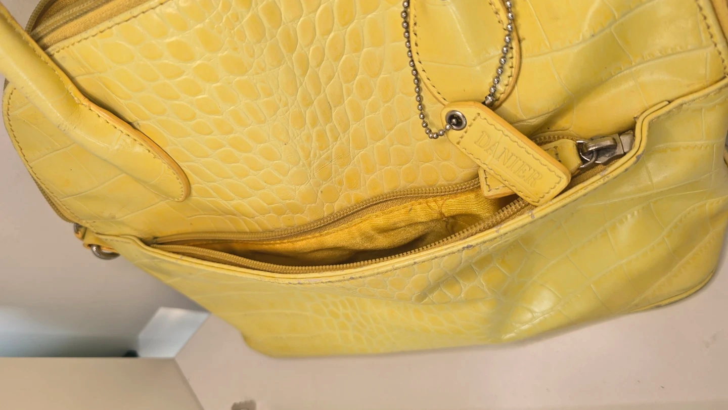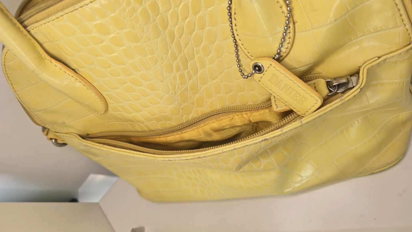 Selling a Danier yellow leather purse. It's a stylish and functional bag perfect for everyday use. The purse has a unique crocodile-like texture and a spacious interior with multiple pockets for organization